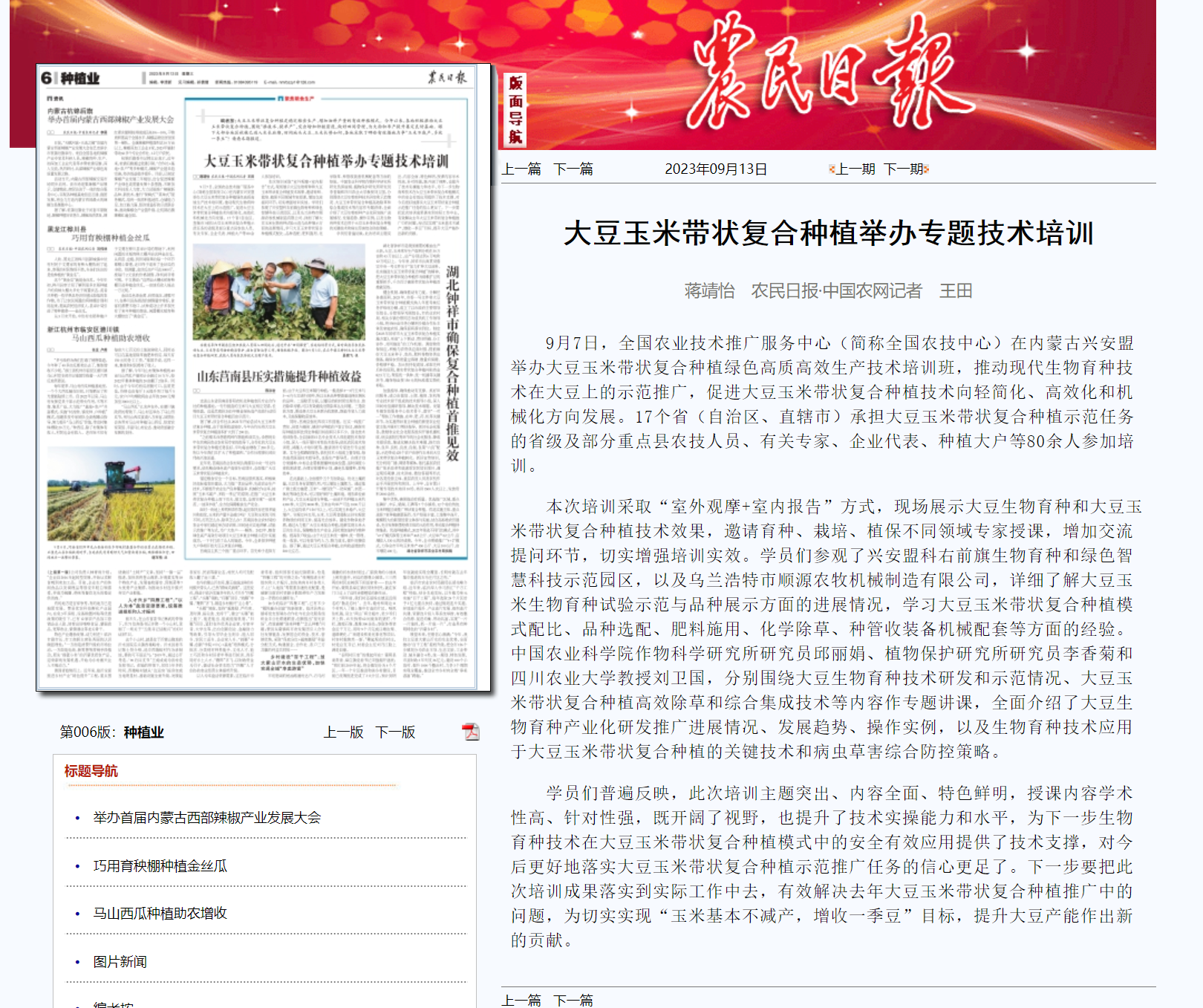 9月7日,全国农业技术推广服务中心(简称全国农技中心)在内蒙古兴安盟举办大豆玉米带状复合种植绿色高质高效生产技术培训班,推动现代生物育种技术在大豆上的示范推广,促进大豆玉米带状复合种植技术向轻简化、高效化和机械化方向发展。17个省(自治区、直辖市)承担大豆玉米带状复合种植示范任务的省级及部分重点县农技人员、有关专家、企业代表、种植大户等80余人参加培训。