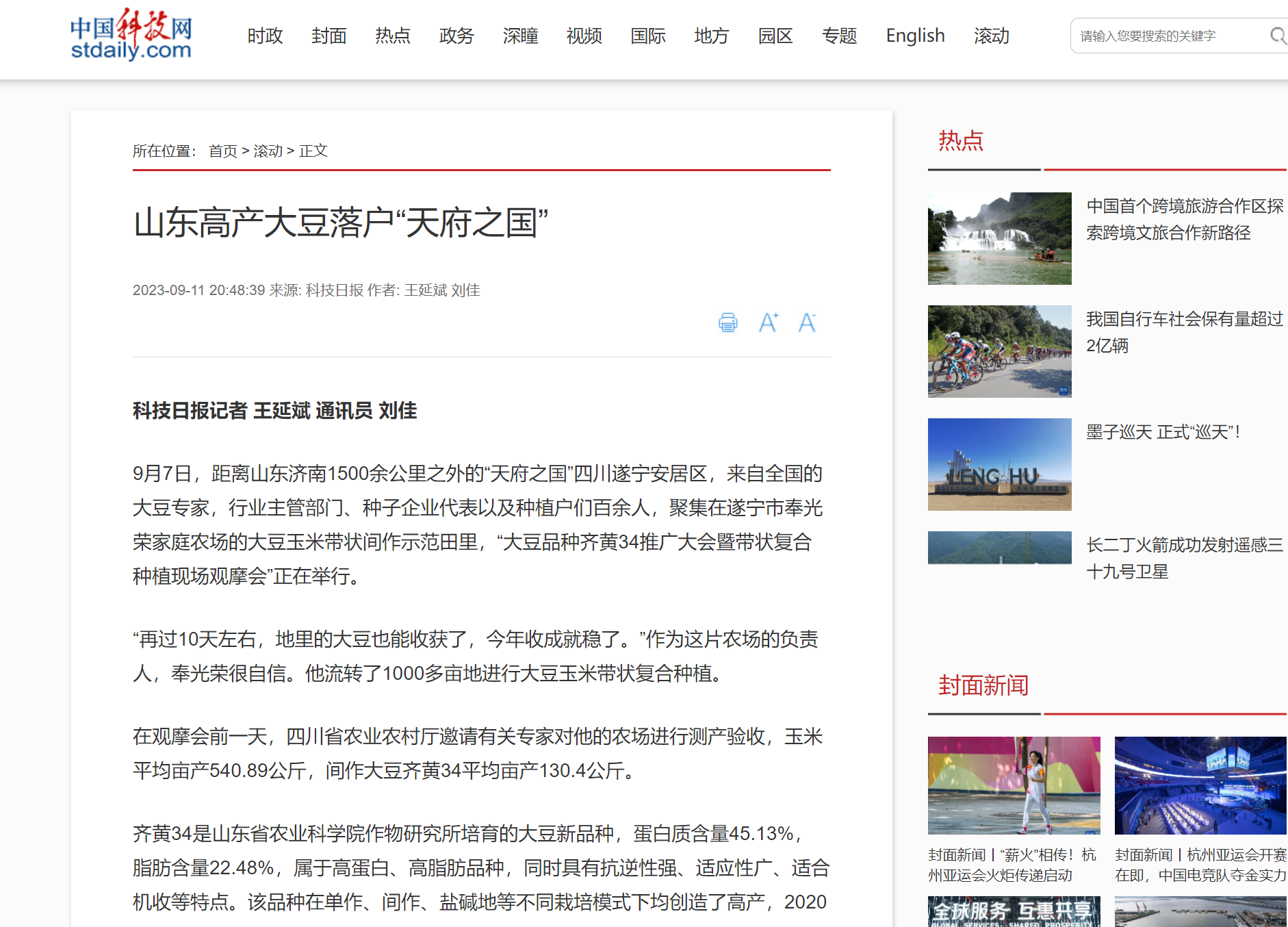 9月7日,距离山东济南1500余公里之外的“天府之国”四川遂宁安居区,来自全国的大豆专家,行业主管部门、种子企业代表以及种植户们百余人,聚集在遂宁市奉光荣家庭农场的大豆玉米带状间作示范田里,“大豆品种齐黄34推广大会暨带状复合种植现场观摩会”正在举行。