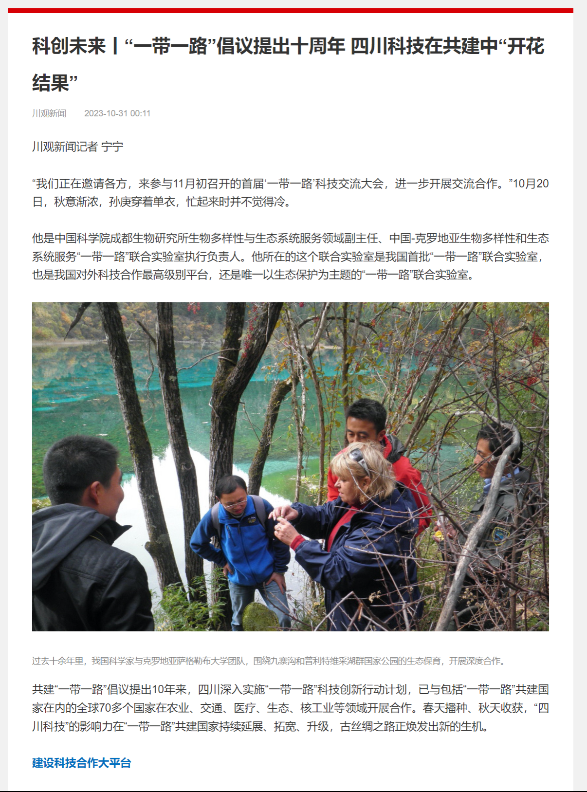 10年来,四川成立世界钙华自然遗产研究与保护联盟,建成国家级“一带一路”联合实验室2个,国际科技合作基地90个,平台合作对象覆盖100余个国家、地区和国际组织。
