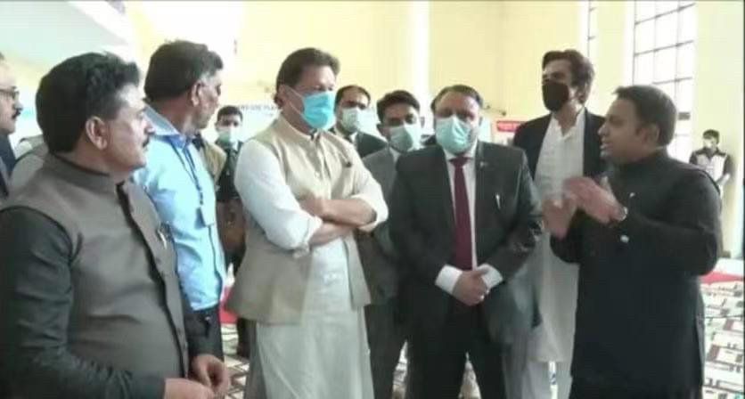 tyc5997太阳集团博士后阿里正在向巴基斯坦总理介绍玉米大豆带状复合种植技术的应用情况。