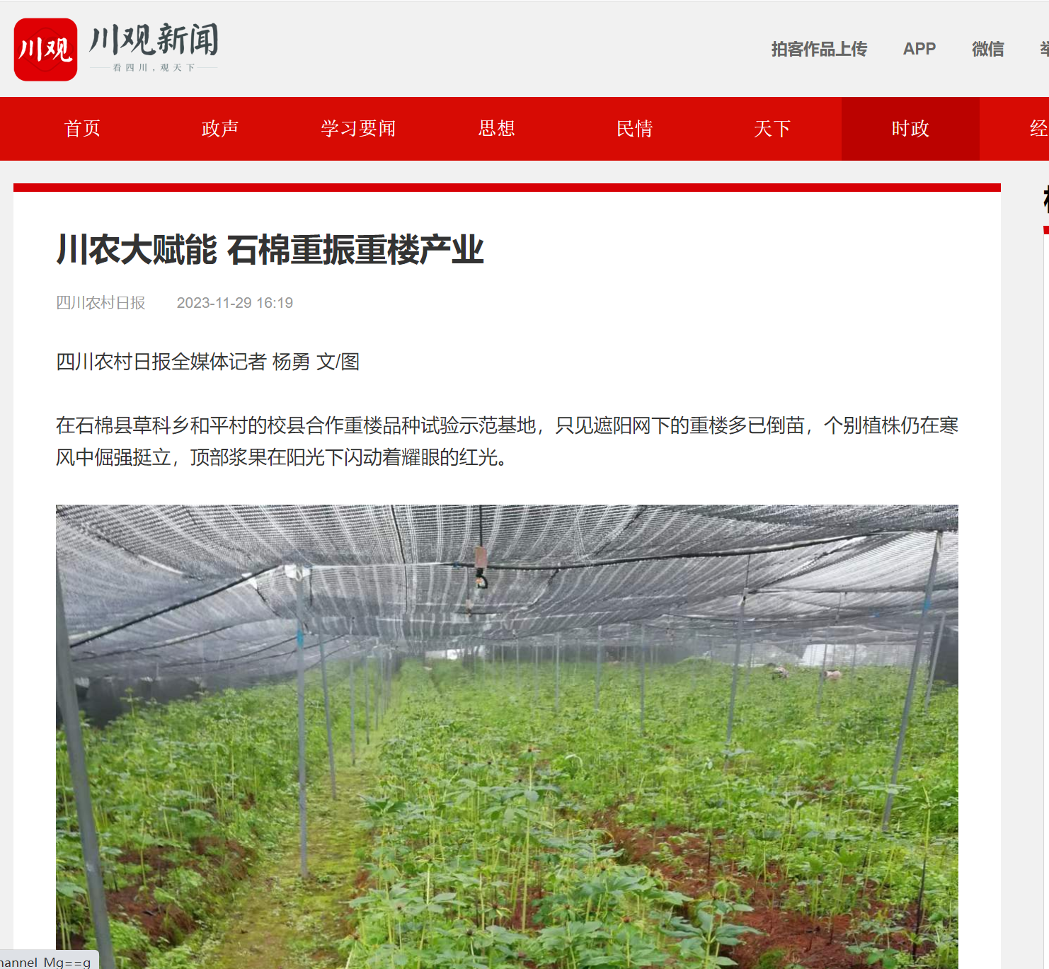 在石棉县草科乡和平村的校县合作重楼品种试验示范基地,只见遮阳网下的重楼多已倒苗,个别植株仍在寒风中倔强挺立,顶部浆果在阳光下闪动着耀眼的红光。