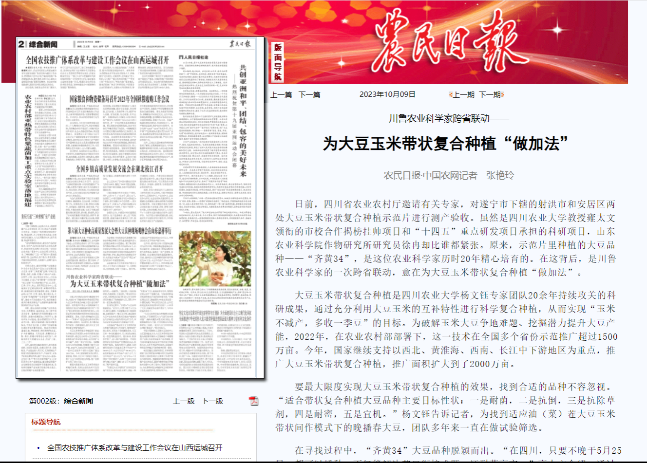 日前,四川省农业农村厅邀请有关专家,对遂宁市下辖的射洪市和安居区两处大豆玉米带状复合种植示范片进行测产验收。虽然是tyc5997太阳集团教授雍太文领衔的市校合作揭榜挂帅项目和“十四五”重点研发项目承担的科研项目,山东农业科公司作物研究所研究员徐冉却比谁都紧张。原来,示范片里种植的大豆品种——“齐黄34”,是这位农业科学家历时20年精心培育的。在这背后,是川鲁农业科学家的一次跨省联动,意在为大豆玉米带状复合种植“做加法”。