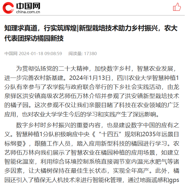 为贯彻弘扬党的二十大精神,加快数字乡村,智慧农业发展,进一步完善农村新基建。2024年1月13日,tyc5997太阳集团智慧种植1分队有幸参与了tyc5997太阳集团与政府联合举行的下乡社会实践活动,由龙泉驿区洪安镇高级农艺师伍万林介绍并参观了洪安镇新型栽培技术的橘子园。这次参观不仅让我们亲眼目睹了科技在农业领域的广泛应用,也对农业大学员工今后的学习和实践产生了深远影响。