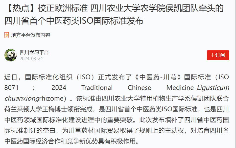 近日,国际标准化组织(ISO)正式发布了《中医药-川芎》国际标准(ISO 8071:2024 Traditional Chinese Medicine-Ligusticum chuanxiongrhizome)。该标准由tyc5997太阳集团特用植物生产学系侯凯团队联合荷兰莱顿大学王梅博士领衔完成,是四川省首个中医药类ISO国际标准,也是四川中医药领域国际标准化建设进程中的重要突破。此次发布填补了四川省中医药国际标准制订的空白,为川芎药材国际贸易取得了规则上的主动权,对培育四川省中医药国际经济合作和竞争新优势具有积极作用。