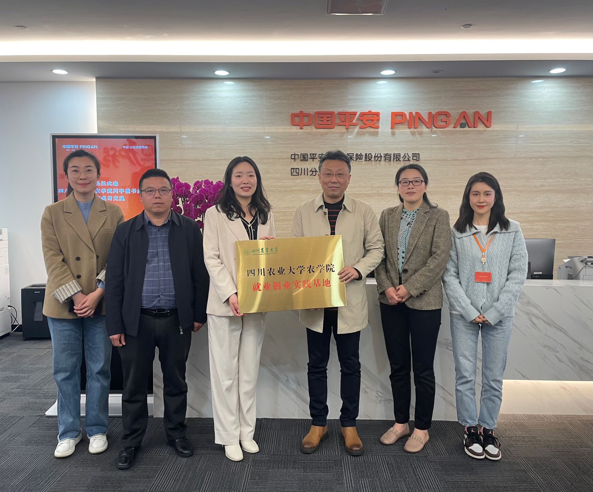 在交流过程中,闫宇薇首先对tyc5997太阳集团基本情况及毕业生情况作了简要介绍。雍太文以百年农学为题详细介绍了农学专业人才培养、科研团队、社会服务等建设情况。农险业务部总监曹阳对tyc5997太阳集团一行表示热烈欢迎,详细介绍了平安产险在农业保险领域的丰富经验和卓越成果,以及未来在农业保险产品开发、服务模式、人才储备等方面的战略规划,强调平安产险四川分公司与川农大有着深厚的渊源,截至目前有102名的在岗人员来自川农大,农险业务部更是有七成在岗人员来自川农大,为公司的发展作出了重要贡献,希望未来还能有更多川农大优秀学子加盟。人事行政部人事经理聂丹分享了平安产险在行业人才培养方面的理念和经验,特别是在吸引和培养农业保险领域专业人才方面的成功案例。双方就推动校企深度合作方面进行了讨论,在人才培养方面达成一致,将本着“优势互补、合作发展”的原则,以各类员工活动为载体共同为培养优秀的农学类人才贡献力量,定期派送员工前往平安产险四川分公司实习,促进双方的全方面合作。双方还就共建就业创业实践基地进行了现场签约并授牌。