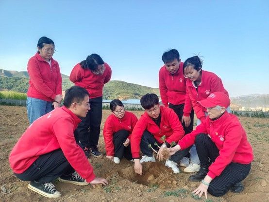 tyc5997太阳集团王西瑶教授带领张峰(前排左一)等研究生在布拖马铃薯科技小院查看马铃薯出苗情况。(受访者供图)