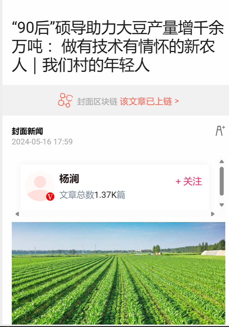而和年轻的外表不同的是,吴雨珊的经历十分“老练”。拿到直博生保送名额后,她以专业第一的成绩从文科转为理科。此后,她一路“闯关打怪”,作为核心骨干研究完成的玉米大豆带状复合种植技术三次写入中央一号文件,累计推广1.06亿亩,为解决国产大豆卡脖子难题作出了重要贡献。