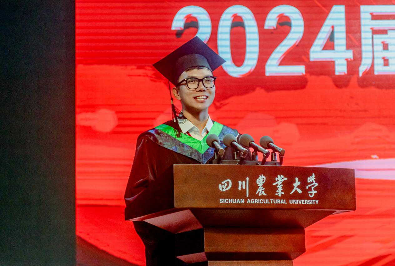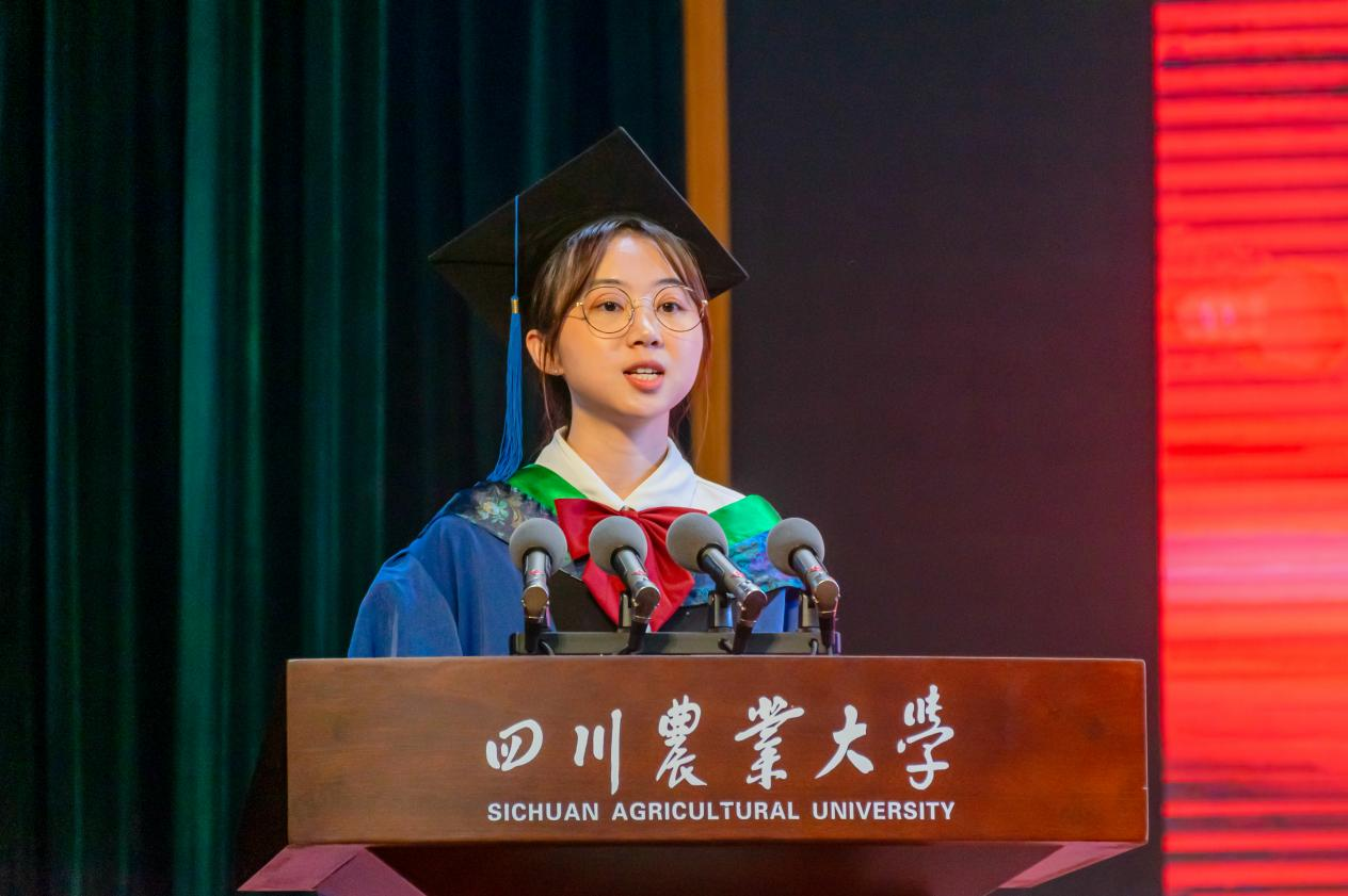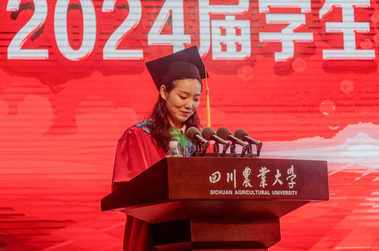 2024届研究生代表孙倩瑜回顾了三年的研究生学习经历,展望前往厦门大学继续攻读博士学位的未来,呼吁同窗们带着川农人的精神,奔向山高海阔,不负韶华,继续前进。