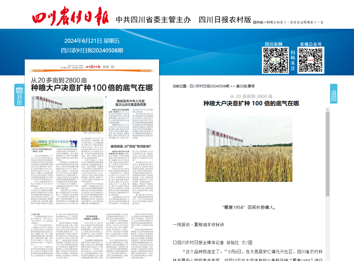 在高产基础上,“蜀麦1958”对条锈病和白粉病表现出高抗性,对赤霉病表现出中抗性。在良种繁育一线磨炼了36年的四川玉麦吨粮农业科技有限公司相关负责人何永金对该品种信心十足,“2022年,在这个品种还没通过审定时,我们就一眼相中了它,矮秆、穗多、抗病性好,增产潜力非常大。”