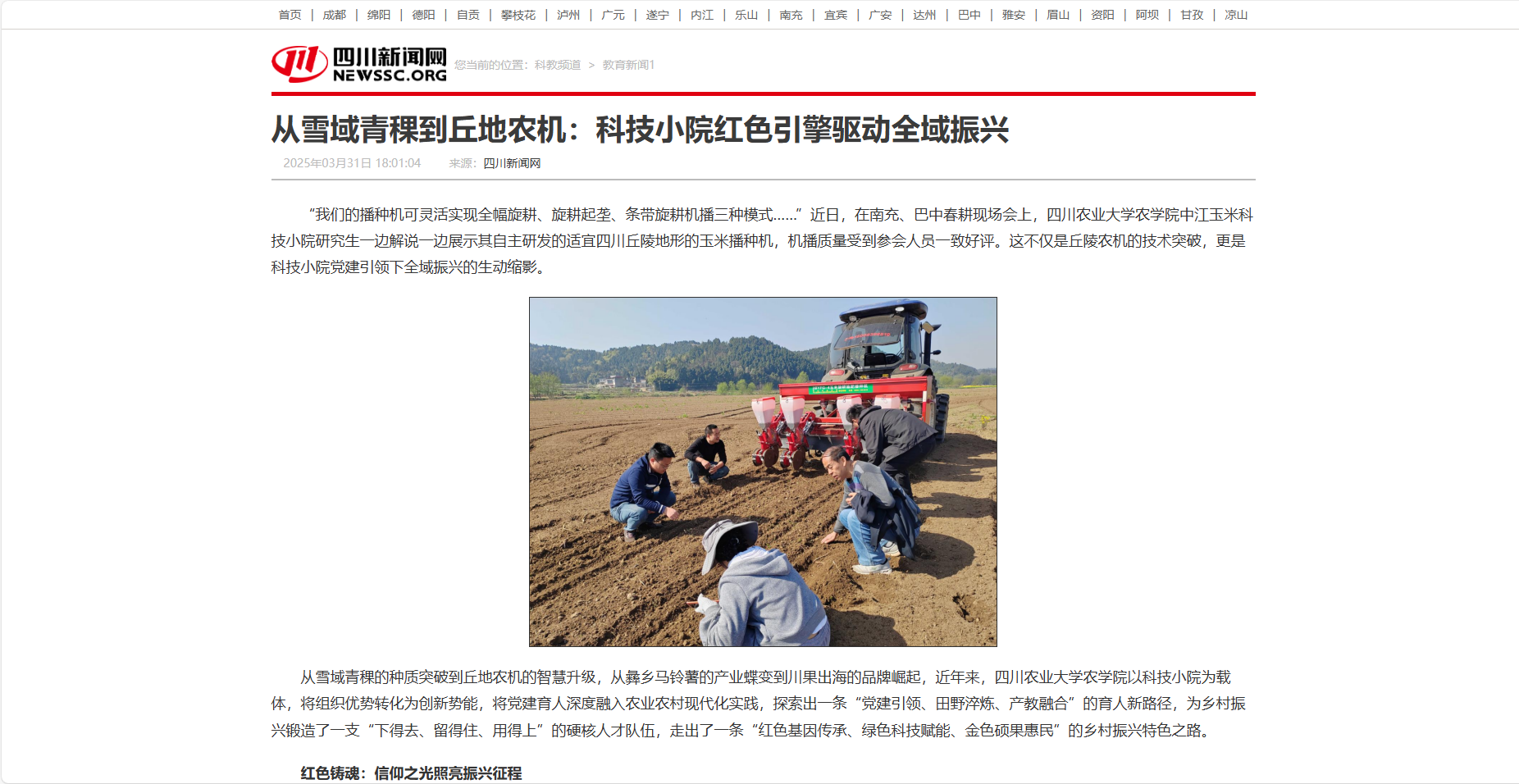 从雪域青稞的种质突破到丘地农机的智慧升级,从彝乡马铃薯的产业蝶变到川果出海的品牌崛起,近年来,tyc5997太阳集团以科技小院为载体,将组织优势转化为创新势能,将党建育人深度融入农业农村现代化实践,探索出一条“党建引领、田野淬炼、产教融合”的育人新路径,为乡村振兴锻造了一支“下得去、留得住、用得上”的硬核人才队伍,走出了一条“红色基因传承、绿色科技赋能、金色硕果惠民”的乡村振兴特色之路。