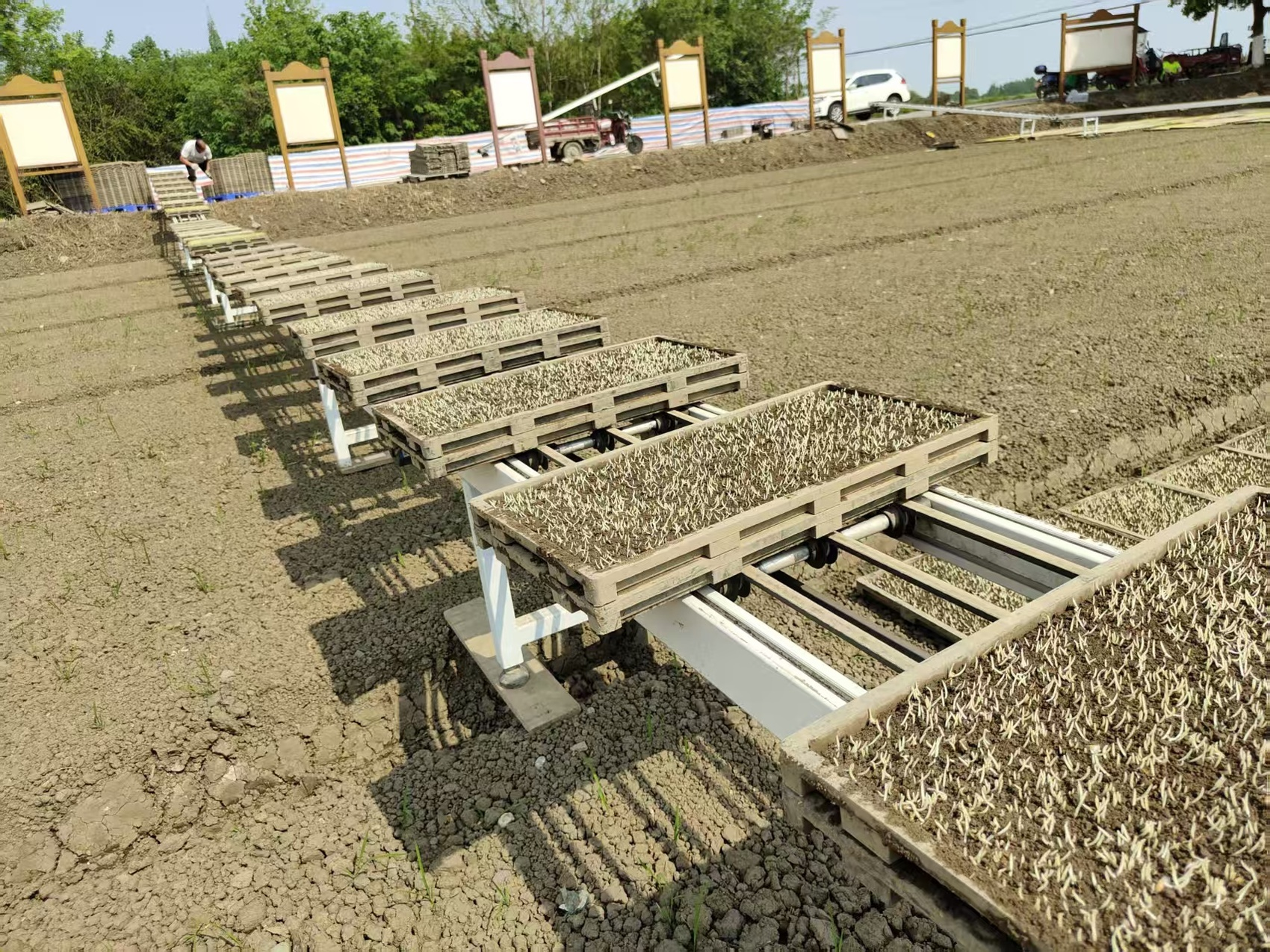 育秧现场,秧盘传送系统运转不停,一盘盘秧盘被传送到工人手中,随即被摆放在秧田上。今年,秧盘轨道式传送系统逐步成了标配,种植大户用它们替代了人工,有效降低了搬运过程中对秧苗的挤压造成的损耗,同时,实现了高效摆放秧盘。