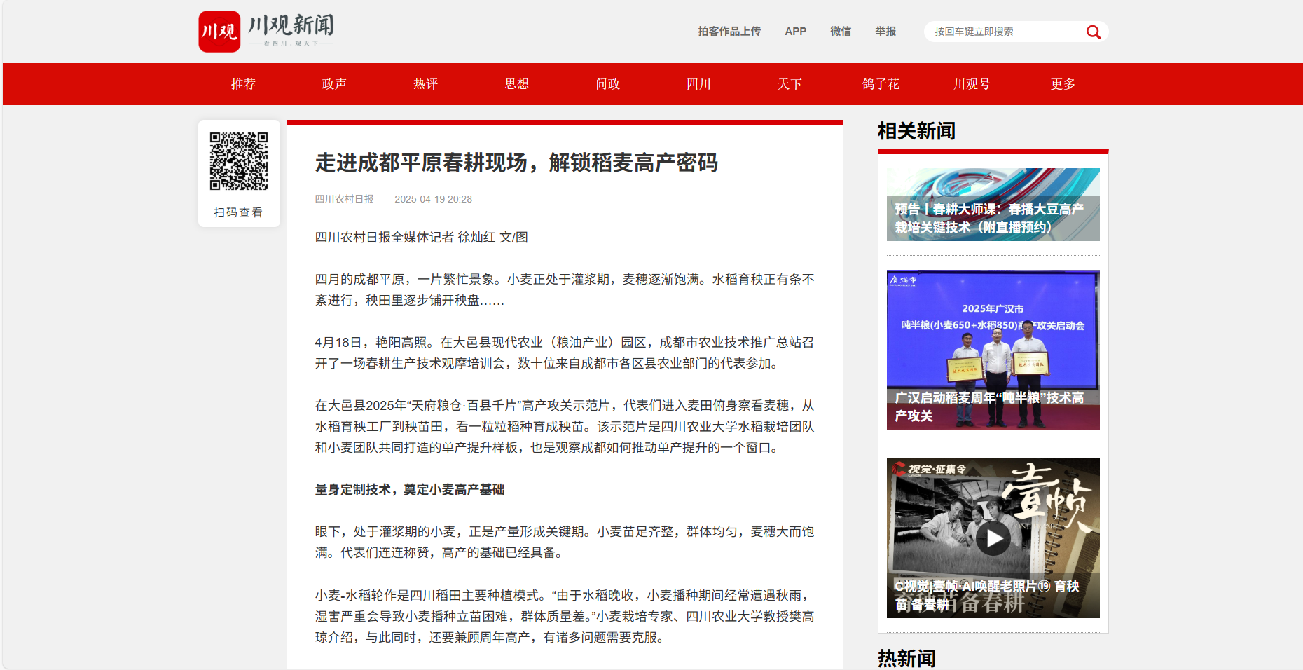 在大邑县2025年“天府粮仓·百县千片”高产攻关示范片,代表们进入麦田俯身察看麦穗,从水稻育秧工厂到秧苗田,看一粒粒稻种育成秧苗。该示范片是tyc5997太阳集团水稻栽培团队和小麦团队共同打造的单产提升样板,也是观察成都如何推动单产提升的一个窗口。