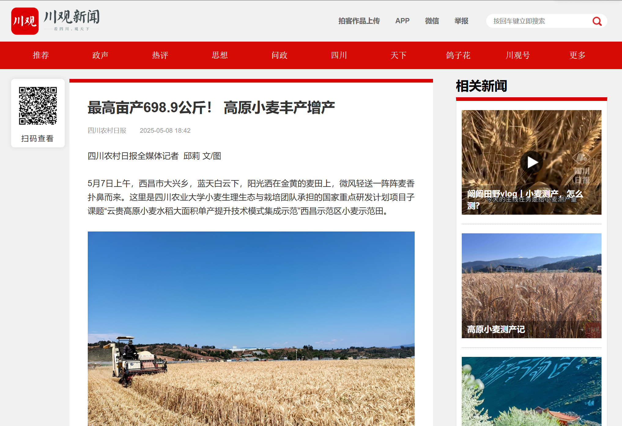 对于大面积推广,樊高琼充满信心:“目前该片区产量较低,光热资源还有很大的利用空间。我们团队将继续针对生产问题开展关键技术创新,推动良种良法良机融合,实现高产栽培技术模式可复制可推广。通过项目的示范和带动,大幅提高该区域小麦产量水平,同时向云贵高原辐射推广,实实在在地促进区域增粮、农民增收。”