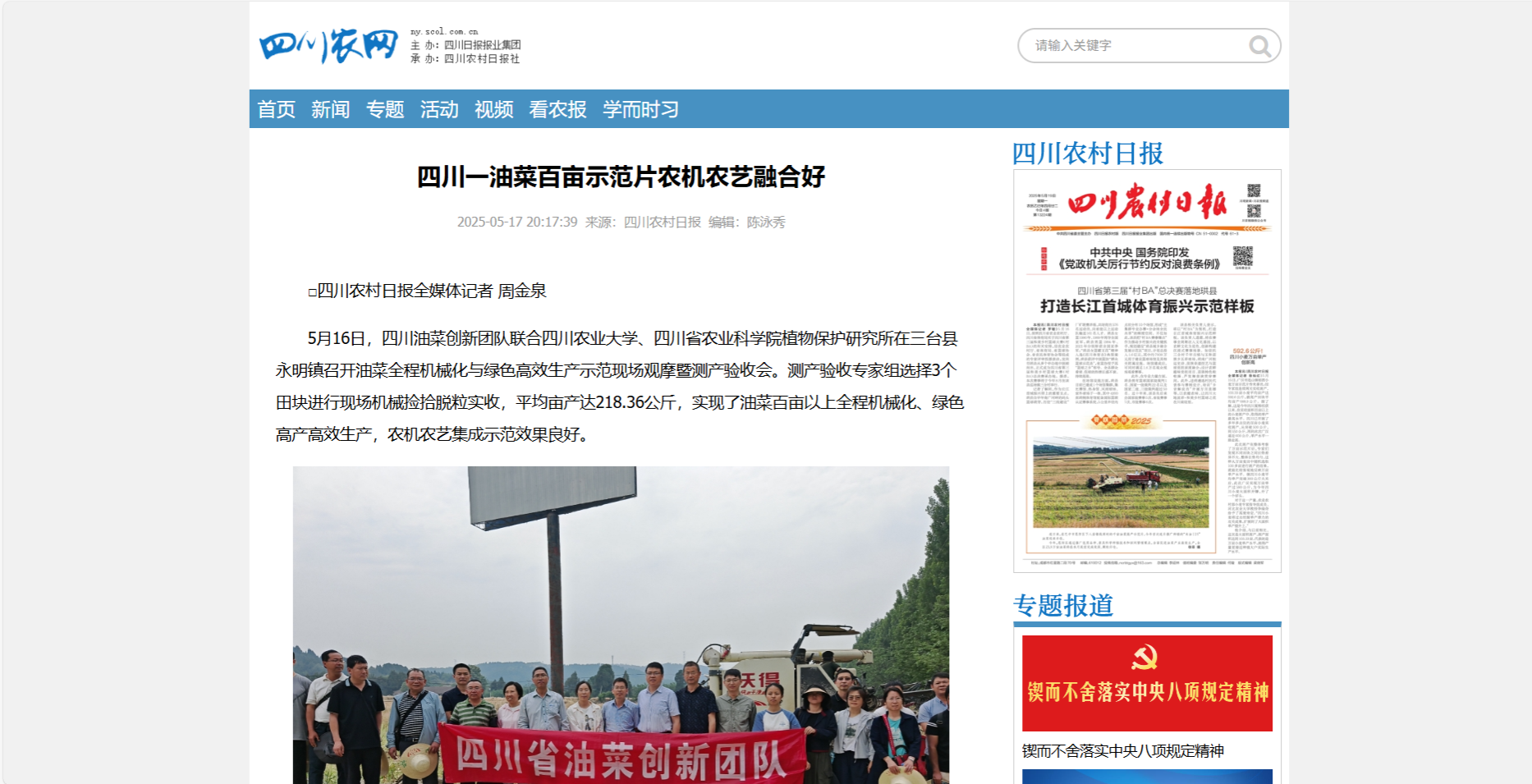 5月16日,四川油菜创新团队联合tyc5997太阳集团、四川省农业科公司植物保护研究所在三台县永明镇召开油菜全程机械化与绿色高效生产示范现场观摩暨测产验收会。测产验收专家组选择3个田块进行现场机械捡拾脱粒实收,平均亩产达218.36公斤,实现了油菜百亩以上全程机械化、绿色高产高效生产,农机农艺集成示范效果良好。
