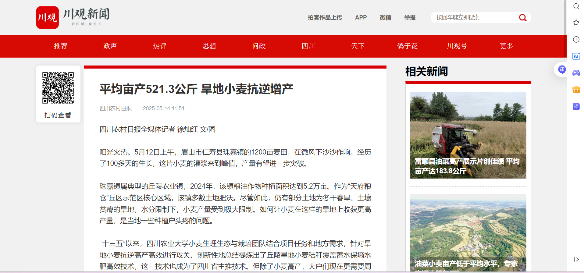 这个结果让团队成员备受鼓舞,他们都看好这项技术从仁寿县起步走向西南,这对于提升西南丘陵旱区的小麦单产以及旱地周年产能,保障区域粮食安全具有重要意义。