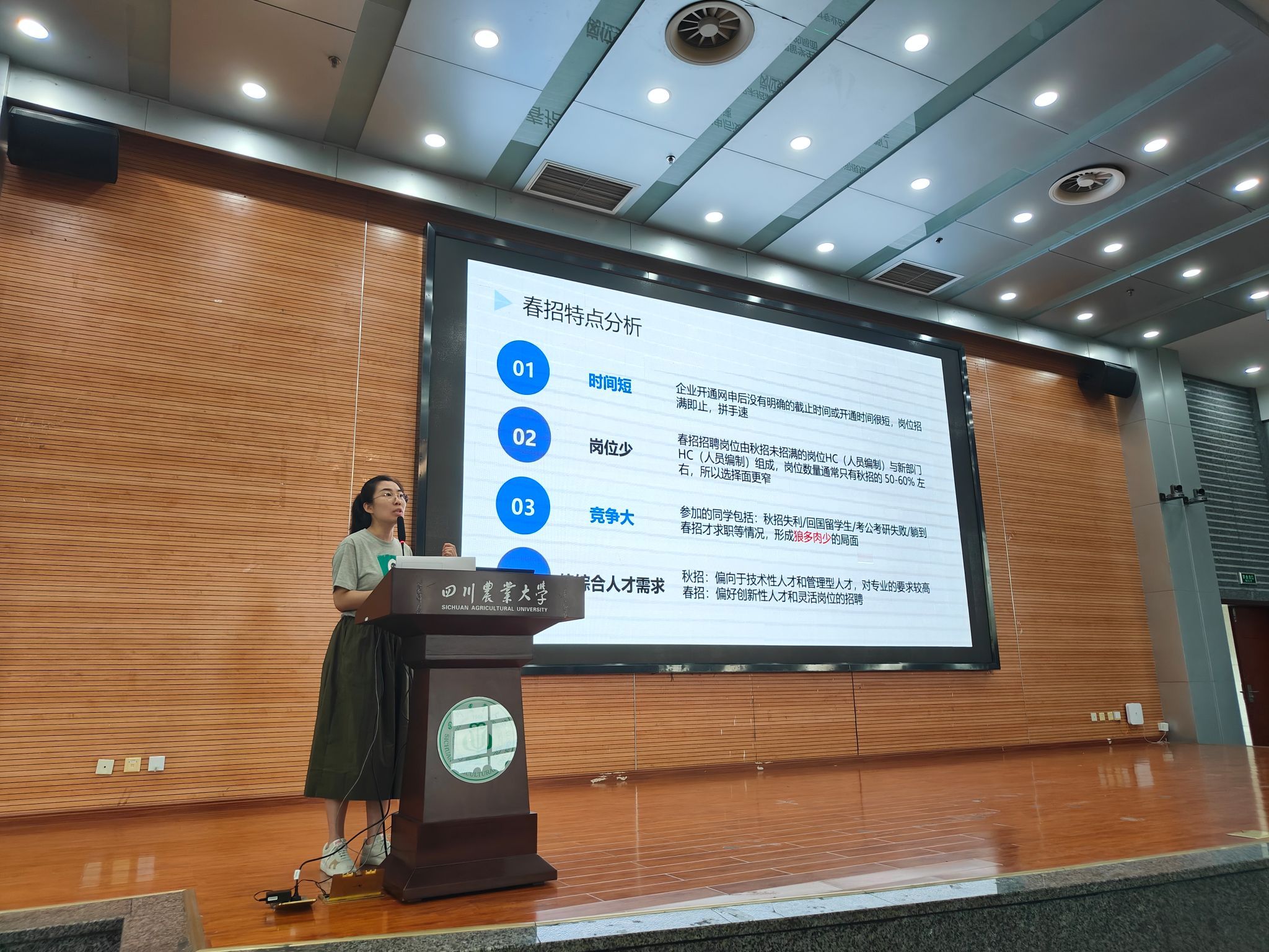 公司本科生就业秘书贾佳详细介绍了应届毕业生可选择的六大就业方向,并系统梳理了校院两级提供的就业指导服务资源。她特别提醒毕业生重视应届生身份的价值,并正确理解与运用三方协议。