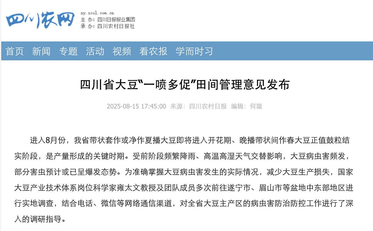 进入8月份,我省带状套作或净作夏播大豆即将进入开花期、晚播带状间作春大豆正值鼓粒结实阶段,是产量形成的关键时期。受前阶段频繁降雨、高温高湿天气交替影响,大豆病虫害频发,部分害虫预计或已呈爆发态势。为准确掌握大豆病虫害发生的实际情况,减少大豆生产损失,国家大豆产业技术体系岗位科学家雍太文教授及团队成员多次前往遂宁市、眉山市等盆地中东部地区进行实地调查,结合电话、微信等网络通信渠道,对全省大豆主产区的病虫害防治防控工作进行了深入的调研指导。