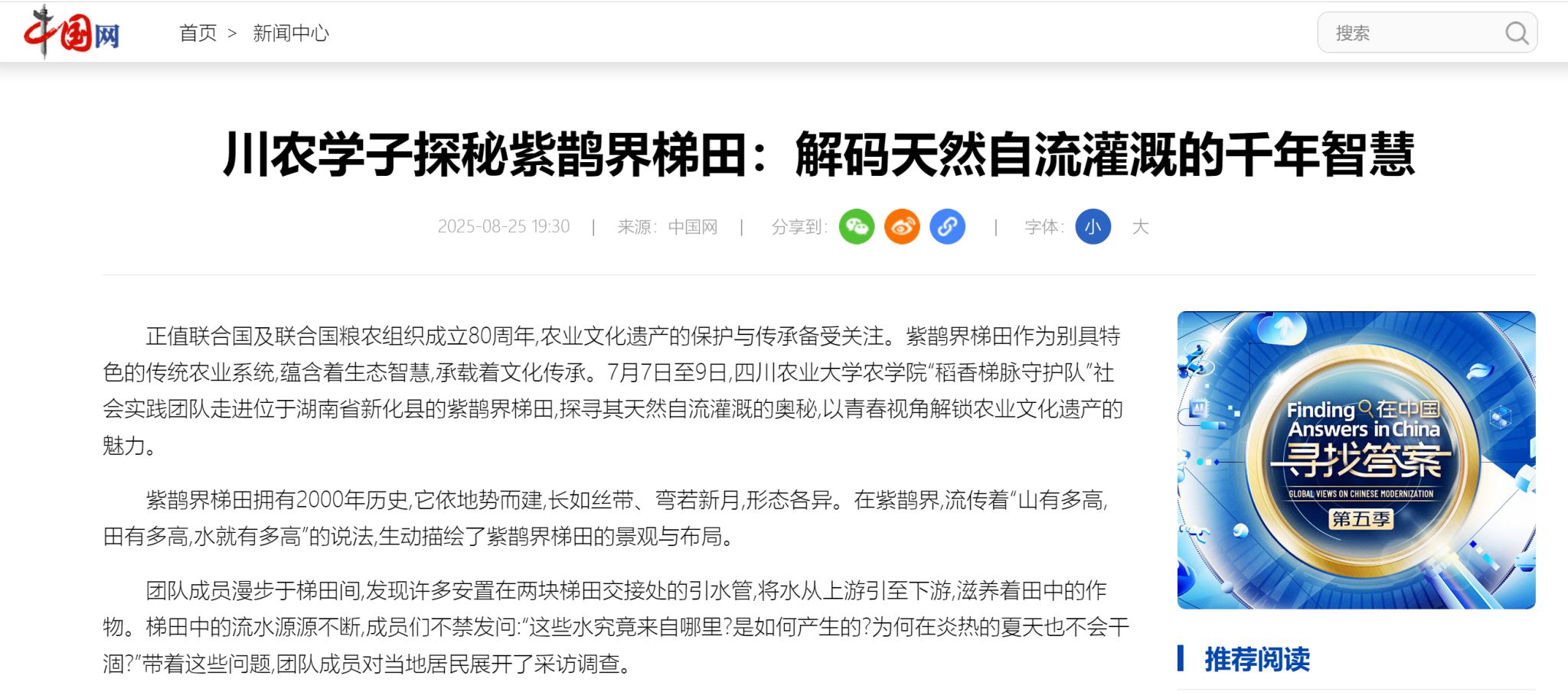 “同为农科人,我们更应该保护好这份珍贵的农业文化遗产!” 在联合国粮农组织成立80周年、全球聚焦农业可持续未来的历史时刻,生态实践者唐镟淼于紫鹊界梯田畔的这句朴实话语,道出了深沉的责任。“稻香梯脉守护队”的探索揭开了 “山高水更高”的千年奥秘——森林涵水源、岩隙织水网、梯田筑水渠,山水共生的智慧谱写着壮丽的“无坝自流”生态史诗。守护这份千年流淌的活态遗产,传承这份惠泽未来的农耕智慧,正是当代农科青年义不容辞的使命。