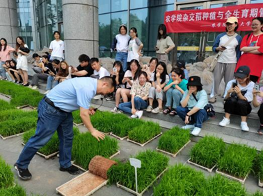 过去的一个月里,参赛队员将水稻种子装盘播种,给水稻苗浇水喷药,记录水稻生长状况,认真对待此次比赛。在初赛评比开始前,各组选手将他们悉心照料了一个月的水稻苗移至三教门前比场地,在实践部同学的组织下有规律地放置。之后,任老师讲解了水稻的发展,袁隆平院士的事迹,并不断鼓励同学们培养种植水稻的兴趣,最后还表扬了选手们的认真态度。评比过程中,几位评委老师通过秧苗的生长状况、秧苗整齐度、健壮程度、弹性好坏及秧苗根系白根数量等方面对参赛小组的水稻进行了评比。临近比赛尾声,任老师给同学们讲解了评分细则,如何才算优良的秧苗,并以育秧效果较好的小组作为实例讲解,此外,樊老师也对本次比赛过程做了总结与评比,并鼓励同学们延续袁隆平院士的禾下乘凉梦,不断学习先进的农业生产技术,助推中国的农业发展。
