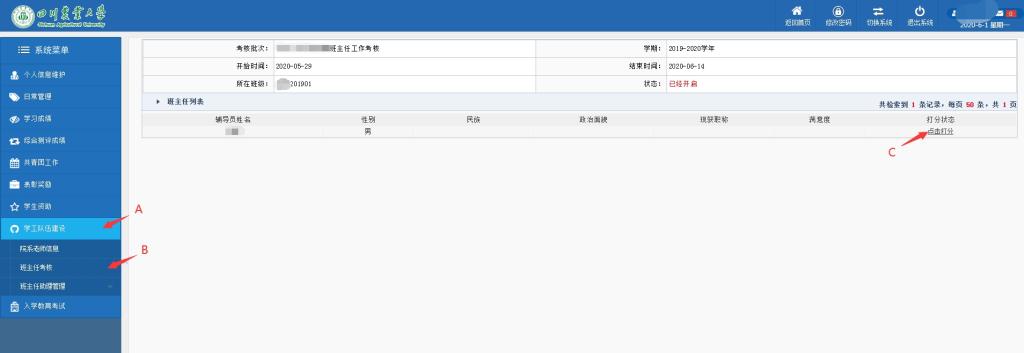 员工通过员工处网站导航栏登录“员工管理工作系统”→A.点击学工队伍建设→B.点击班主任考核→C.点击打分→完成评价