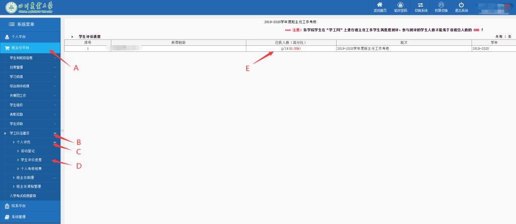 班主任通过员工处主页登录“员工管理工作系统”→A.班主任平台→B.学工队伍建设→C.个人评优→D.员工评价进度→E.已投人数→查看未参与打分同学→提醒小班同学完成打分