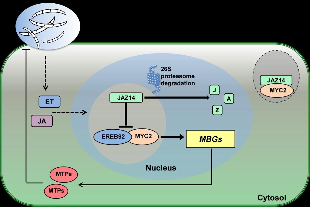 ZmEREB92,ZmMYC2与ZmJAZ14通过茉莉酸与乙烯信号调控禾谷镰刀菌侵染下MTP积累的机制模式图