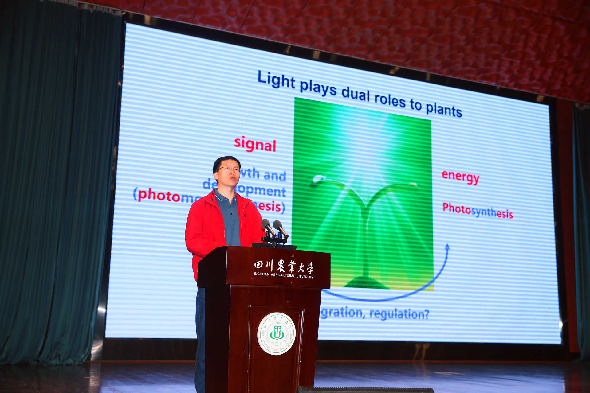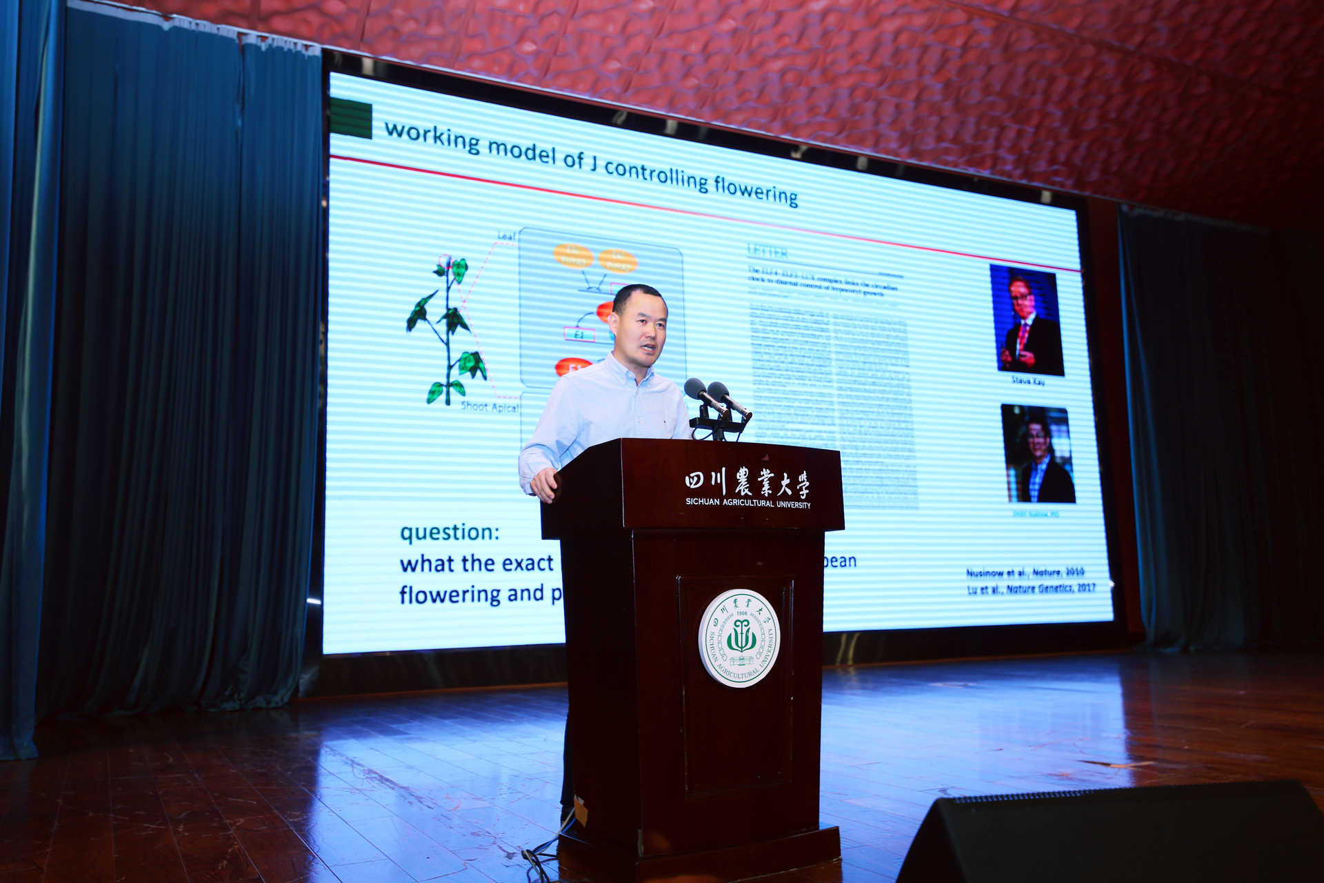 会议期间,倪中福以“小麦绿色革命的遗传育种学基础”,介绍了绿色革命前后小麦矮化育种中基因与激素代谢调控研究的演变、以及小麦穗粒数基因的研究进展小麦半矮秆及穗粒数控制基因的研究进展,并对未来小麦单产提升提出思考。孔凡江以“大豆光周期敏感性与分子育种”为题,介绍了团队在大豆光周期敏感性等领域的研究成果,以及在分子育种上的运用。林荣呈做题为“叶绿体与细胞核之间的信号通讯”的报告,介绍了光信号在转录后及翻译后水平对光合作用/叶绿体的调节作用,以及逆行信号如何启动和转导以调节光形态的产生。杨文强以“大豆碳代谢酶功能研究”,从我国大豆的供需矛盾出发,介绍了大豆碳代谢酶对大豆产量的影响。李继刚以“远红光信号转导的分子机制”为题,围绕光敏色素信号转导的分子机制、光拮抗ABA信号的分子机制、光与低温信号互作的分子机制、光调控植物耐盐的分子机制以及光调控植物逆境响应的分子机制等方面介绍了光敏色素信号转导的分子机制。田丰教授做题为“玉米适应温带的分子遗传基础”的报告,介绍了玉米转录因子ZmMADS1对玉米开花、产量等的调控作用。谭禄宾以“水稻株型驯化的分子机理”为题,介绍了野生稻驯化的过程,以及其中蕴含的分子机理。姚颖垠以“小麦籽粒储藏蛋白与加工品质改良”为题,介绍了小麦籽粒中高分子量谷蛋白、低分子量谷蛋白以及醇溶蛋白等储藏蛋白对小麦加工品质的影响,以及相关控制基因的发掘和在育种中的应用。