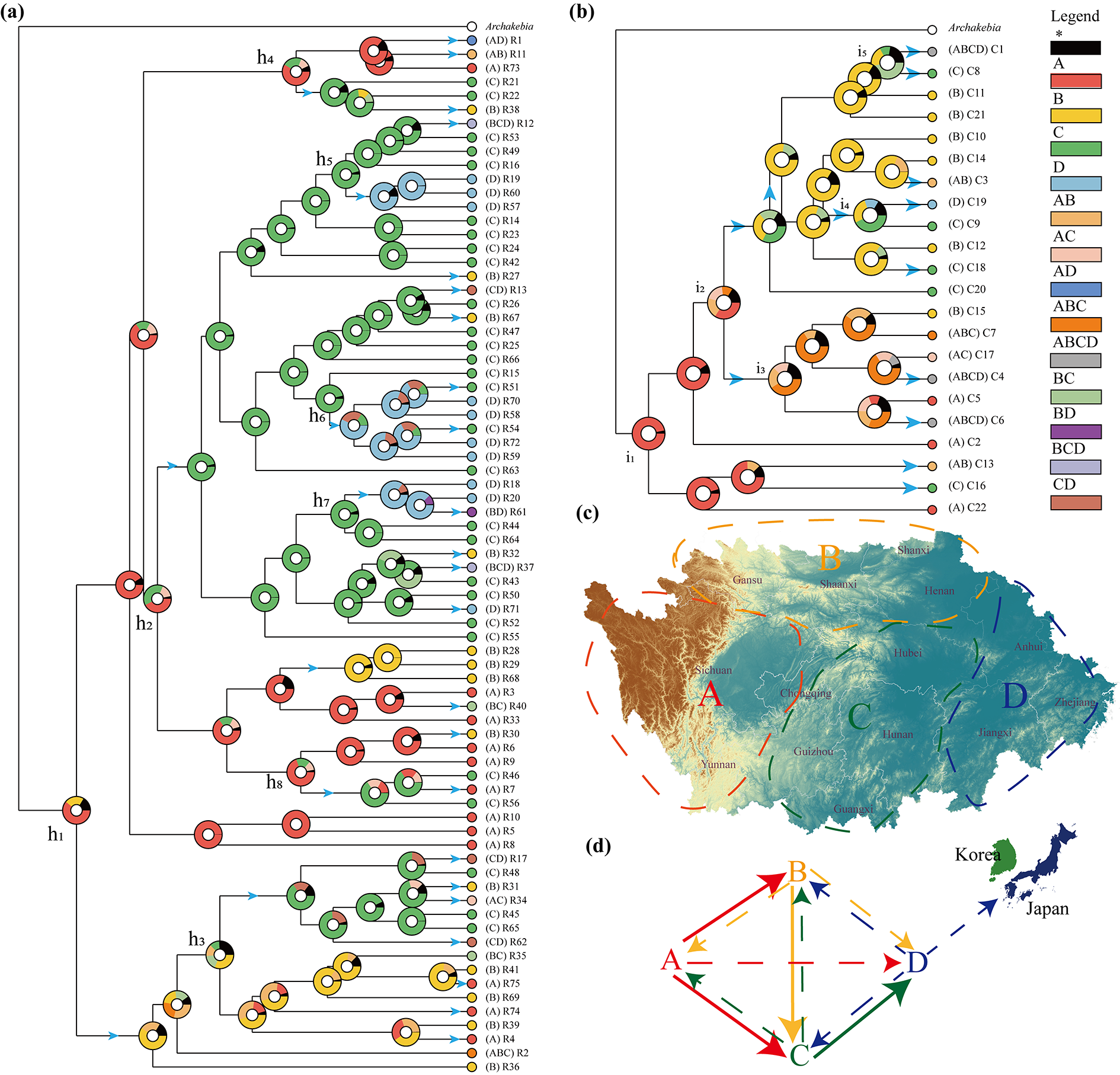图2(a)ITS单倍型和(b)rps16单倍型序列基于RASP中Bayesian Binary MCMC(BBM)方法的祖先分布区重建图(c)三叶木通的分布区:A、青藏高原东部区域;B、中国中北部区域;C、中国中部区域;D、中国东部区域(d)三叶木通扩张或传播事件推测图