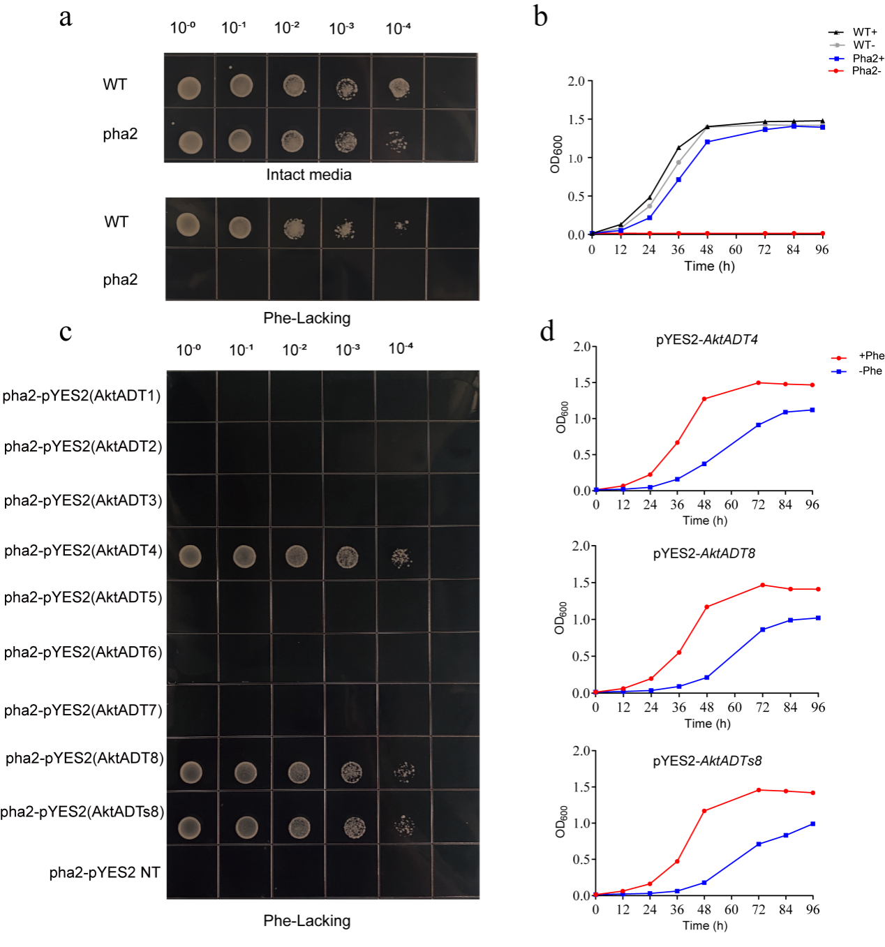 研究证实了AktADT1、4、7、8及s8具有底物混杂性可利预苯酸作为底物行使PDT功能,进一步在酵母pha2敲除株中转化诱导表达,AktADT4、AktADT8和AktADTs8能在酵母体内行使PDT功能从而恢复酵母敲除株pha2的生长表型。且系统发育分析表明,PAC结构域的两个基本残基组合(Val314/Ala317或Ala314/Val317)对ADT的兼性PDT活性至关重要。