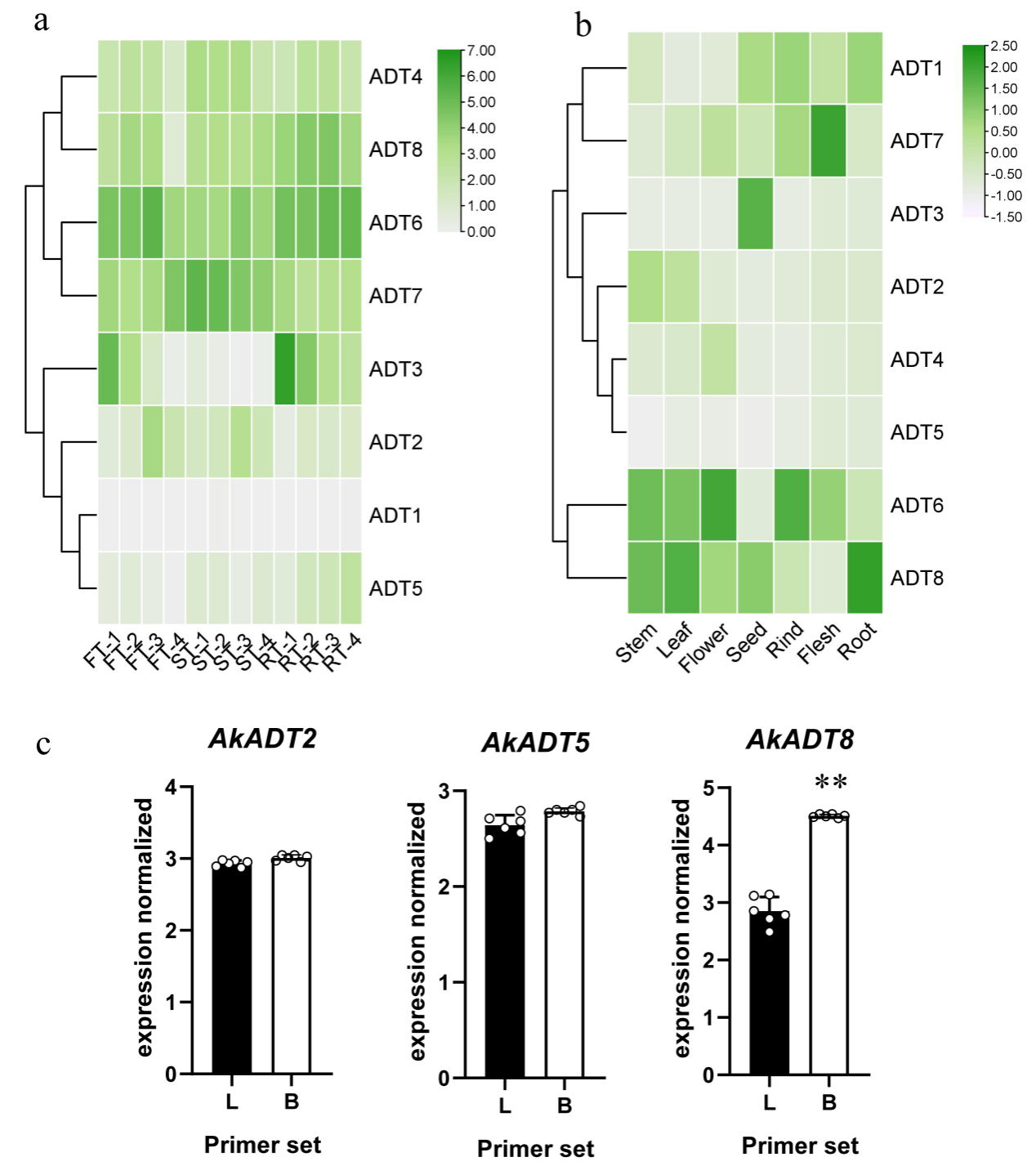 转绿组数据和qRT-PCR结果均显示,AktADTs基因呈现出明显的组织与时间特异性表达,这可能与其功能密切相关。序列比对发现AktADT2、AktADT5和AktADT8的开放阅读框内存在第二个起始密码子,分别位于第一个起始密码子下游的第133、54和177个氨基酸;利用植物启动子数据库对转录起始位点进行预测,结果表明仅有AktADT8存在2个转录起始点,随后利用同一基因不同区域的特异引物qRT-PCR分析进一步证实了这一事实。