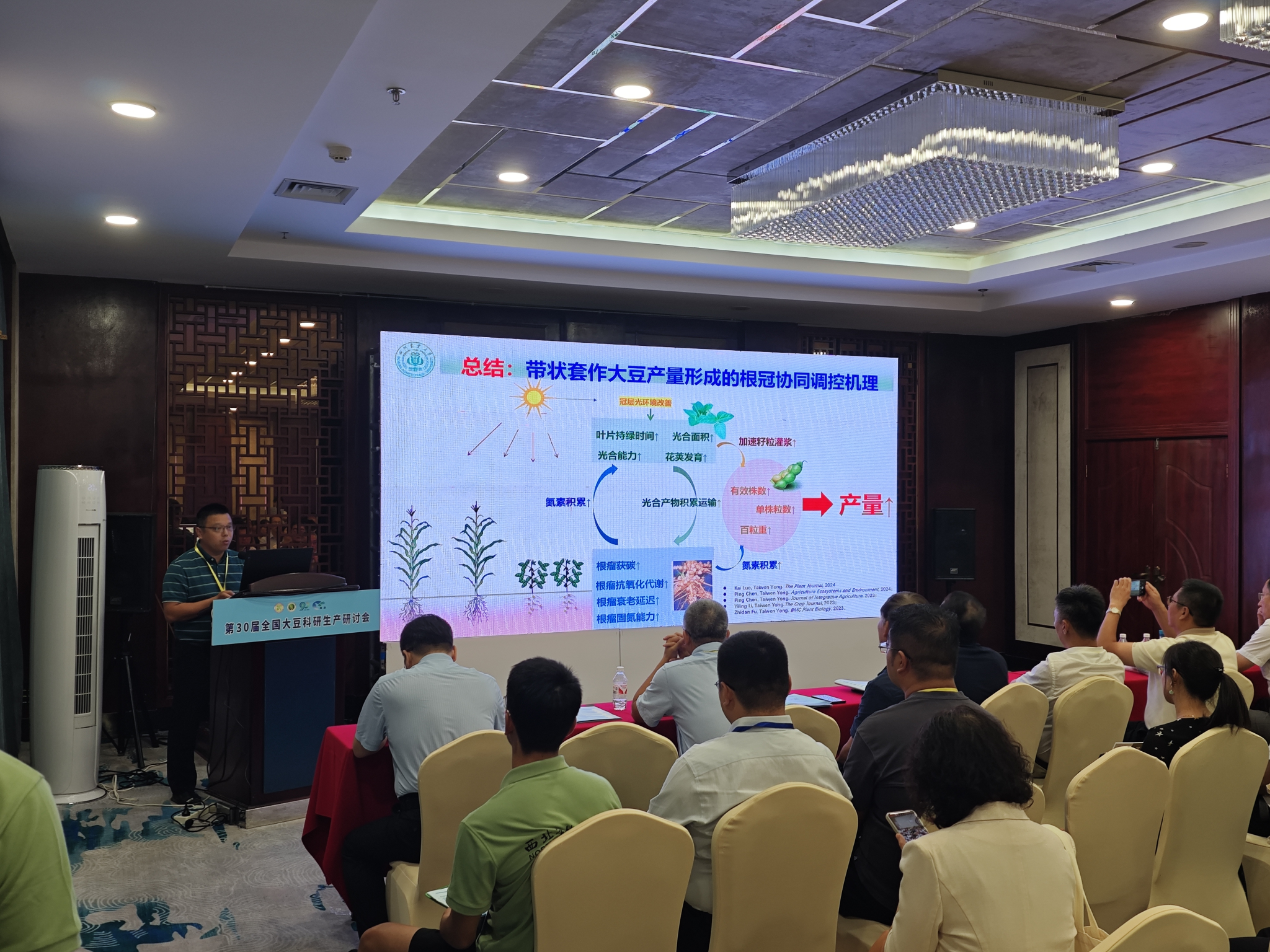 为促进大豆科研生产交流,推动产业创新形成新质生产力,助力中国大豆产业繁荣与振兴,8月23日至25日,由中国作物学会大豆专业委员会主办,西北农林科技大学和杨凌高新技术产业示范区管委会共同承办的第30届全国大豆科研生产研讨会在陕西杨凌召开。本次会议主题为“培育新质生产力,推动大豆产业高质量发展”,围绕遗传育种与资源、基因组与分子生物学、生产管理与产业、大豆高油高产等主题,结合大豆遗传育种、栽培耕作、营养品质、光周期反应、抗病性、抗虫性、耐逆性、营养高效利用等方面的最新研究,来自50余所高校、科研院所、企业的800余名代表展开了深入的交流分享。公司生命公司经理刘江教授、tyc5997太阳集团雍太文教授率大豆玉米带状复合种植与循环利用团队多名师生代表参会。