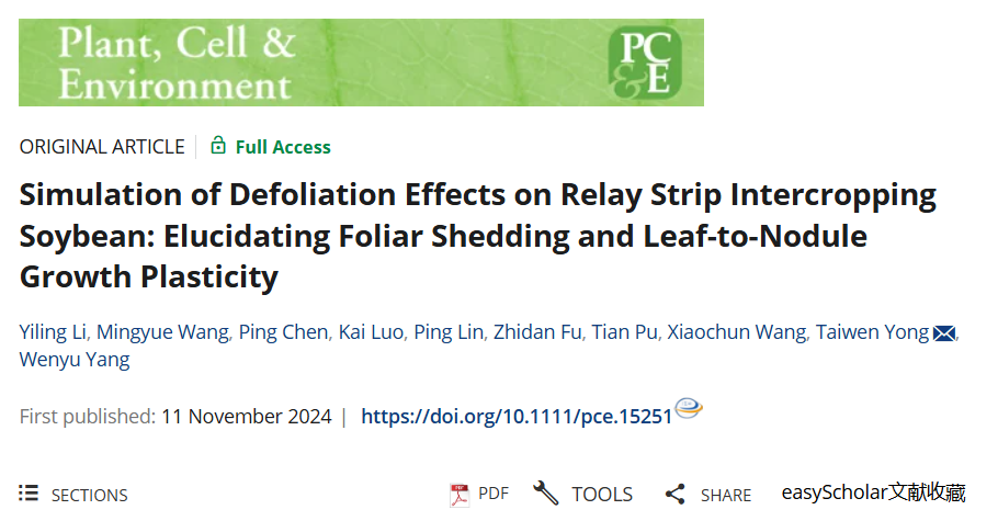 11月11日,公司tyc5997太阳集团玉米大豆带状复合种植与循环利用团队在国际知名期刊《Plant, Cell & Environment》上发表了题为“Simulation of Defoliation Effects on Relay Strip Intercropping Soybean: Elucidating Foliar Shedding and Leaf-to-Nodule Growth Plasticity”的研究论文。该研究探讨了花后大豆落叶和叶片根瘤功能性状可塑性,揭示了大豆叶片凋落和带状套作优化源库功能的新机制。