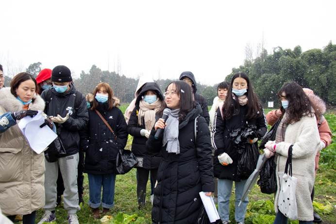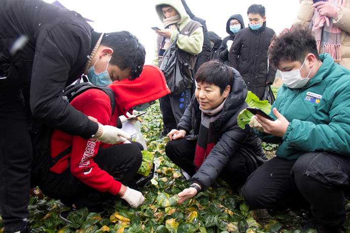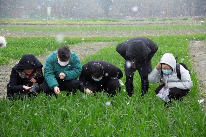 1月7日,成都迎来了2021年的第一场雪。tyc5997太阳集团植物保护专业2018级的50余名同学在龚国淑教授、蒋素容、王海建、李沛利、尚静、常小丽、邱小燕等专业老师带领下,伴着风雪来到青浦园基地,开展了一场别开生面的课程教学实习。