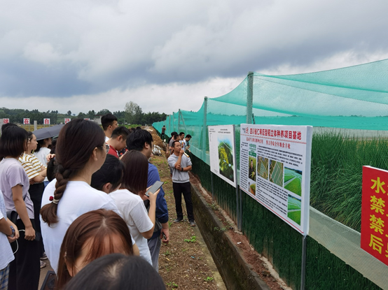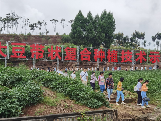 下午,一行人在带领下来到了坐落于丘陵地区的玉米-大豆带状复合种植技术集成研究与示范基地。丘陵地区的土地分散破碎,在流转整治后,技术人员选用优良大豆品种,运用绿色先进的农业生产技术科学播种、合理施肥,并充分发挥间套种植、生物农业的优越性,以达到高产高效。在地头间,雍太文教授就生态农业管理的重要性与方法做了进一步解释,加深了同学们对绿色生态农业的学习与理解。最后,同学们来到了稻蛙立体种养基地,参观了解了种养技术的综合应用。基地内的水旱轮作,提高了物质的循环利用,其高产、高效、绿色、安全的生产模式,使农民和企业的积极性被充分调动,彻底改变了农民、农业、农村的面貌。