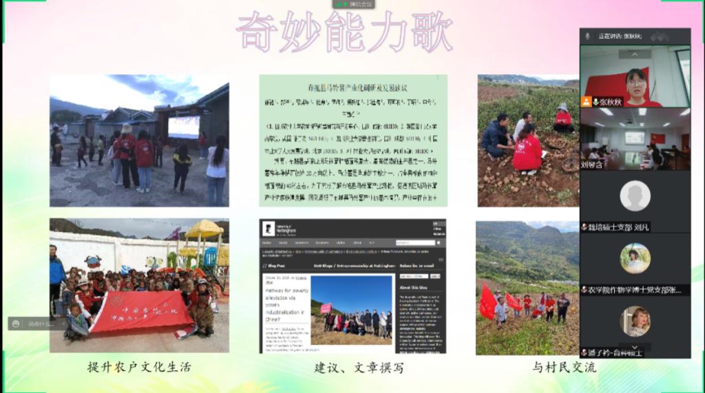 作物栽培与耕作学硕士党支部朱嘉心同志以“我的科技小院歌单”为题,讲述了她在凉山州布拖马铃薯科技小院驻扎的400多个日夜,从“最美的期待”到最后的“我相信”,总共六首歌,她以党旗为感召,以小院为阵地,扎根于布拖的脱贫攻坚战中。“在乃乌村调研时,看到老人孩子都在吃着发芽的土豆,这一幕深深刺激了我。”于是她毅然投身当地扶贫工作,要带给当地农户一套因地制宜的贮藏技术。布拖的生活将她打磨成了全能型的“女汉子”,开得了植保无人机,做得了抖音直播员,当得了水管工,下得了厨房,种的马铃薯比脸还大,立志要让彝族同胞吃上不发芽的马铃薯,坚守精准脱贫的“最后一公里”。朱嘉心感叹:“虽然我的力量微不足道,但作为一名党员,有一分热,发一分光,就如萤火一般,也可以在黑暗里发一点光,不必等候炬火。此后如竟没有炬火,我们便是唯一的光。”