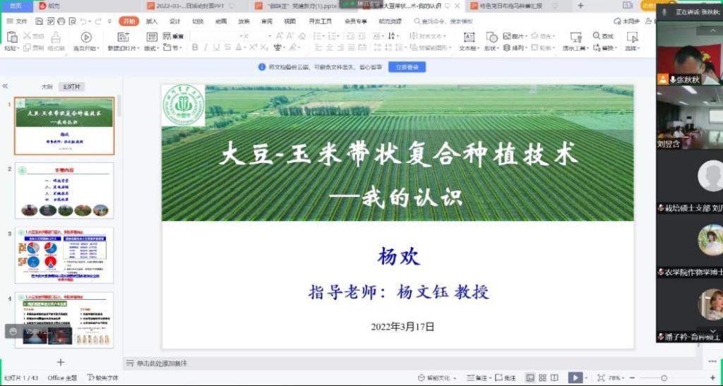为凸显作物学科底蕴优势,展示优秀研究生党员的社会服务成果,塑造优良学风,3月17日晚,由tyc5997太阳集团作物栽培与耕作学硕士生党支部主办,tyc5997太阳集团作物学科其他研究生党支部共同协办的“晒农艺,树新风”主题党日活动在成都校区7教405举行。公司党委书记黎明艳、作物学科各研究生党支部书记受邀参会,线上线下共计150余名研究生党员参加活动。