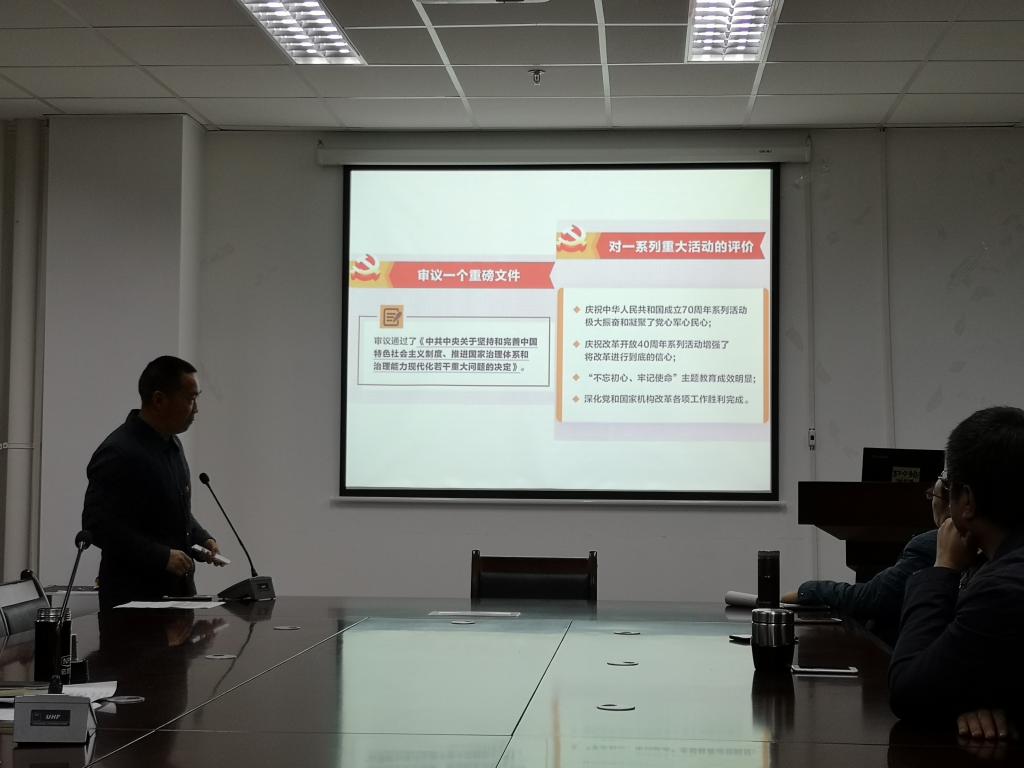 副经理、公司党委委员任万军以图文并茂的形式,从“一个重磅文件”、“一个重要判断”、“十三个‘坚持’”、“一个总体目标”、“一个重大战略任务”等板块,带领党员同志共同学习了《十九届四中全会公报》希望党员同志们继续学习宣传贯彻全会精神,切实把思想和行动统一到全会精神上来,结合公司实际强化举措,狠抓落实,把学习贯彻全会精神与开展“不忘初心、牢记使命”主题教育结合起来,真正在学懂弄通做实上下功夫,进一步增强“四个意识”、坚定“四个自信”、做到“两个维护”。