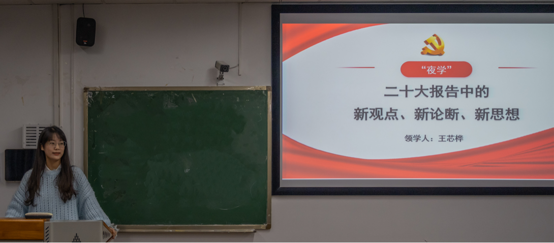主干、部员通过学习党的二十大精神向“外”学,切实做到学思用贯通、知信行统一。“夜学”会上,领学人王芯桦将习近平总书记在党的二十大报告中的一段经典语录引入学习,牢牢抓住党的二十大精神中的新观点、新论点、新思想,从“三个务必”“跳出历史周期律的第二个答案”“党的中心任务”“中国式现代化的五个特色”“中国式现代化的本质要求”“牢牢把握住五个重大原则”“全面建设社会主义现代化国家的首要任务”几个方面为部员展开学习。