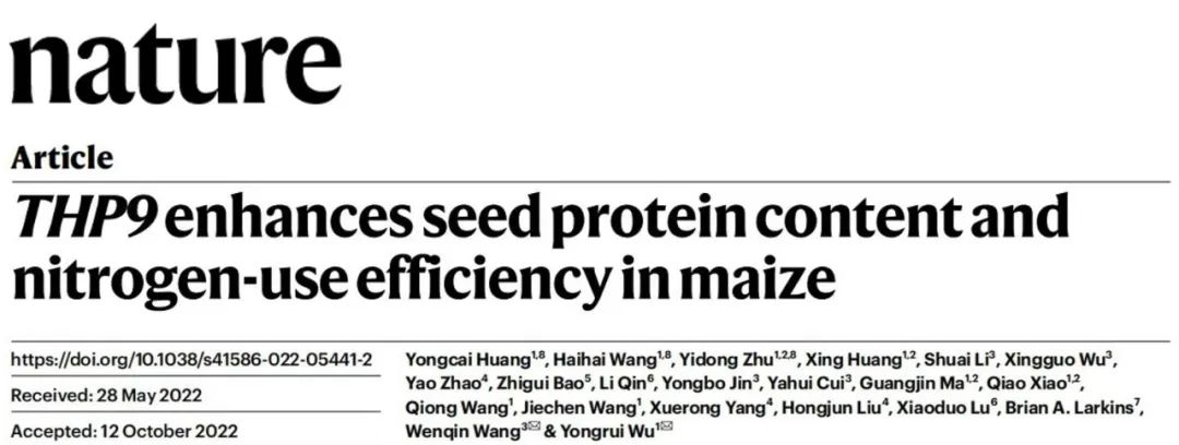 2022年11月17日,国际顶尖学术期刊《Nature》正式刊发了公司员工、中国科公司分子植物科学卓越创新中心博士后黄永财为第一作者,题为“THP9enhances seed protein content and nitrogen-use efficiency in maize”的研究论文。黄永财和他所在的巫永睿组以及合作者王文琴团队,破解了高度复杂的野生玉米基因组,从野生玉米中克隆了控制玉米高蛋白品质形成和氮素高效利用的关键变异基因TeosinteHighProtein 9(THP9)。这不仅有利于现代栽培玉米提高籽粒蛋白含量的遗传改良,而且对将来减少化肥施用和保护生态环境具有重要指导意义。