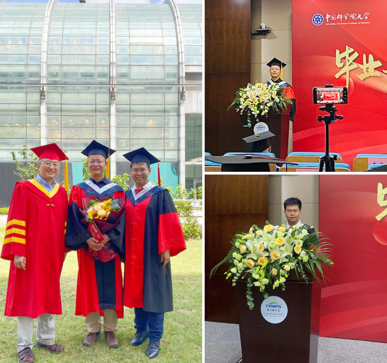 2020年黄永财博士毕业时和所长韩斌院士、导师巫永睿研究员合影。导师巫永睿研究员和黄永财博士分别作为优秀教师代表和优秀博士毕业生代表进行演讲。左图从左至右分别为韩斌院士、巫永睿研究员和黄永财博士。
