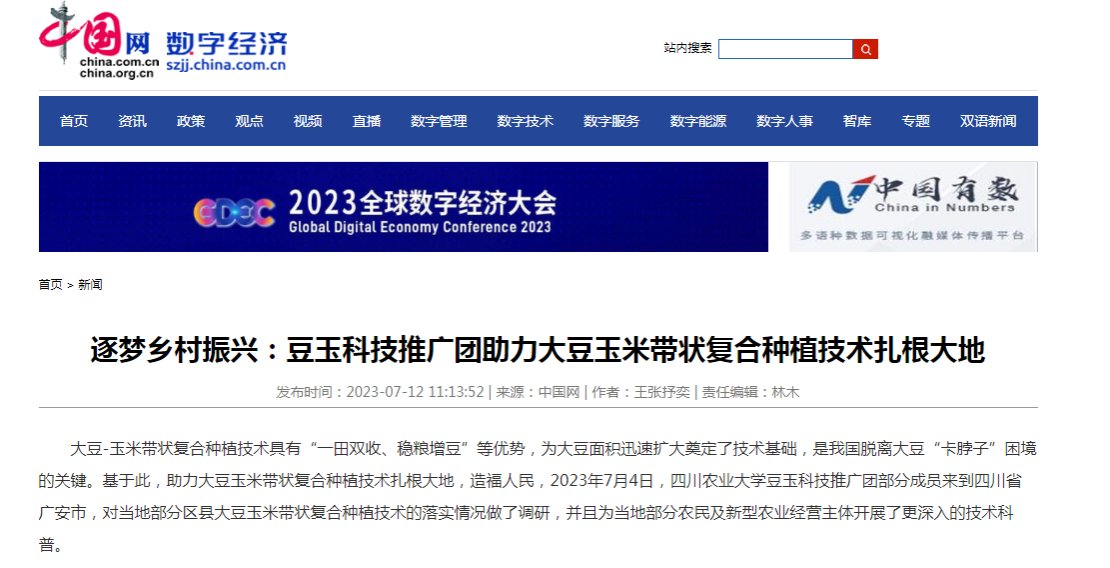 大豆-玉米带状复合种植技术具有“一田双收、稳粮增豆”等优势,为大豆面积迅速扩大奠定了技术基础,是我国脱离大豆“卡脖子”困境的关键。基于此,助力大豆玉米带状复合种植技术扎根大地,造福人民,2023年7月4日,tyc5997太阳集团豆玉科技推广团部分成员来到四川省广安市,对当地部分区县大豆玉米带状复合种植技术的落实情况做了调研,并且为当地部分农民及新型农业经营主体开展了更深入的技术科普。