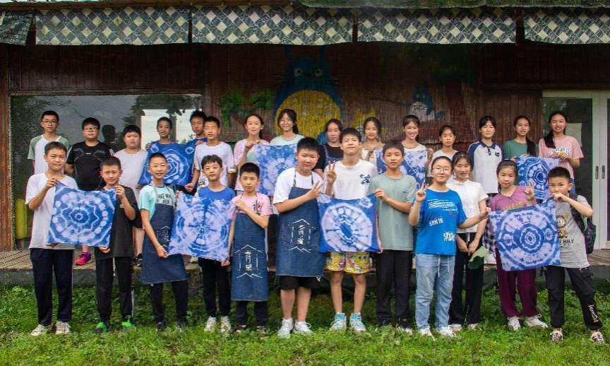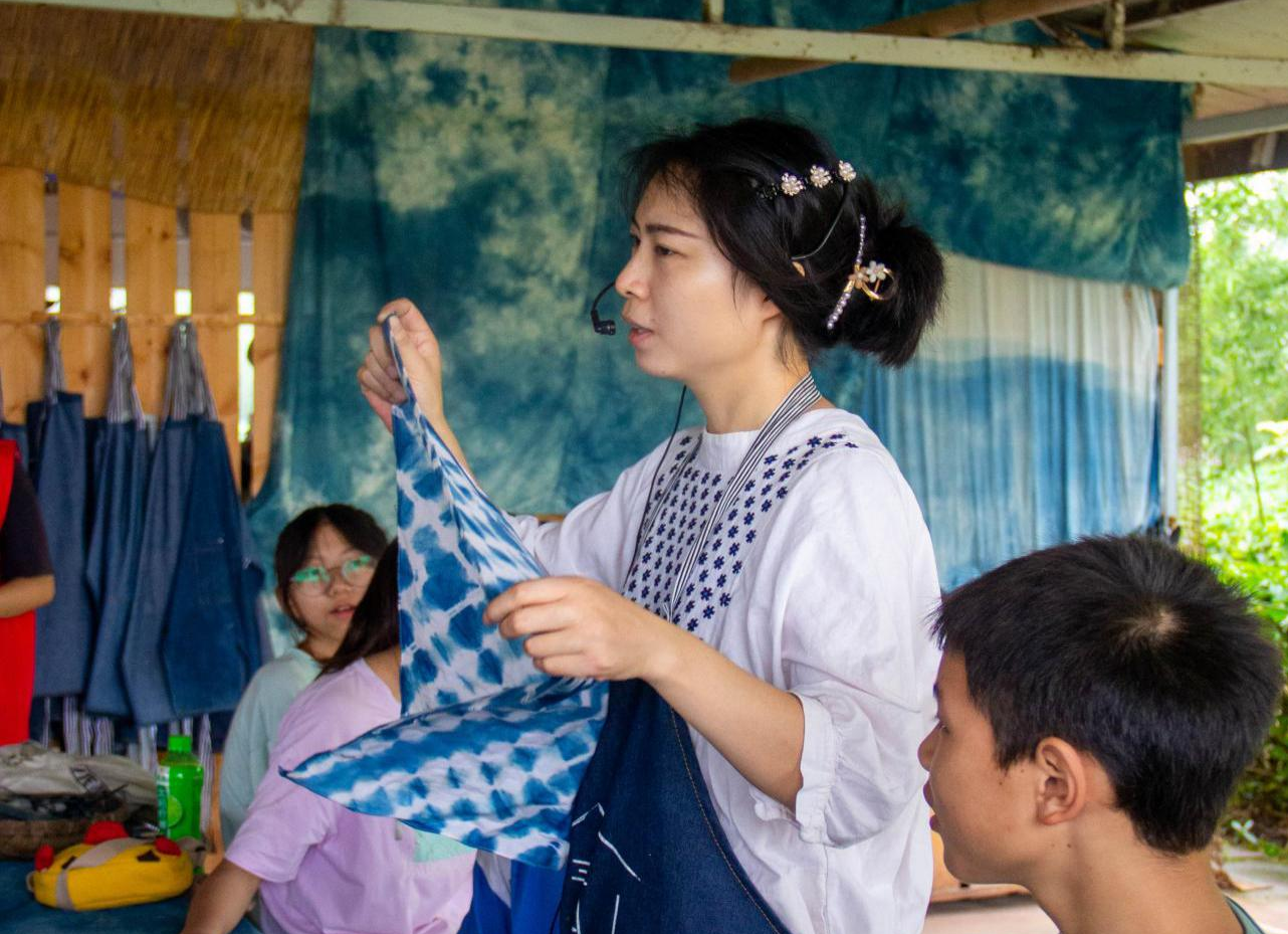 7月12日上午,支教老师们紧接着理论课的节奏,带领同学徒步前往青黛扎染基地体验扎染技艺。罗丹老师向同学们讲述扎染的文化内涵以及其实用性与环保性,并借助精美的扎染成品介绍扎染制作的捆扎方法和五大步骤——浸湿、扎花、染色、拆剪、漂洗。老师讲解完毕后,同学们开始正式体验扎染技艺。“大家最后打开扎染作品的时候就像是拆盲盒,处处都是惊喜。”罗丹在活动完成后总结道。