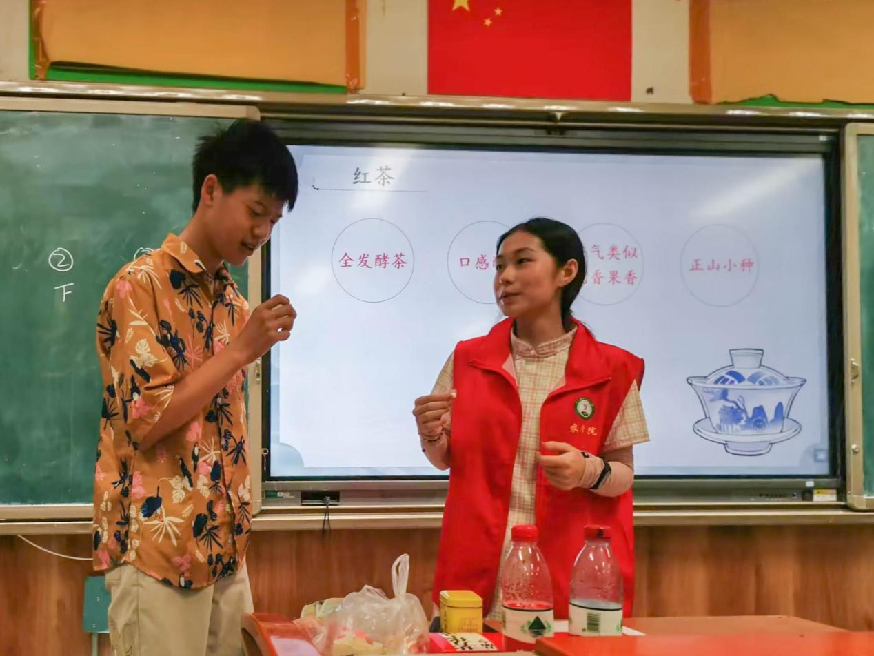 图为支教队员全钰岑邀请王俊杰同学上台品鉴红茶