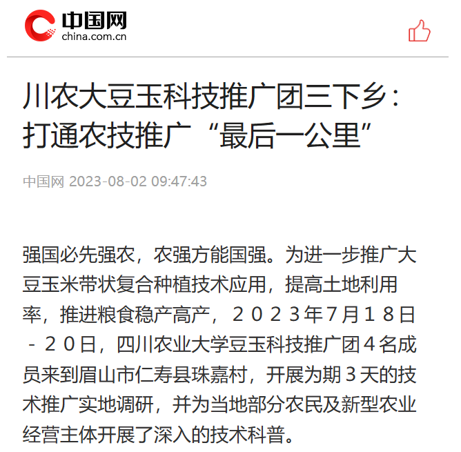强国必先强农,农强方能国强。为进一步推广大豆玉米带状复合种植技术应用,提高土地利用率,推进粮食稳产高产,2023年7月18日-20日,tyc5997太阳集团豆玉科技推广团4名成员来到眉山市仁寿县珠嘉村,开展为期3天的技术推广实地调研,并为当地部分农民及新型农业经营主体开展了深入的技术科普。