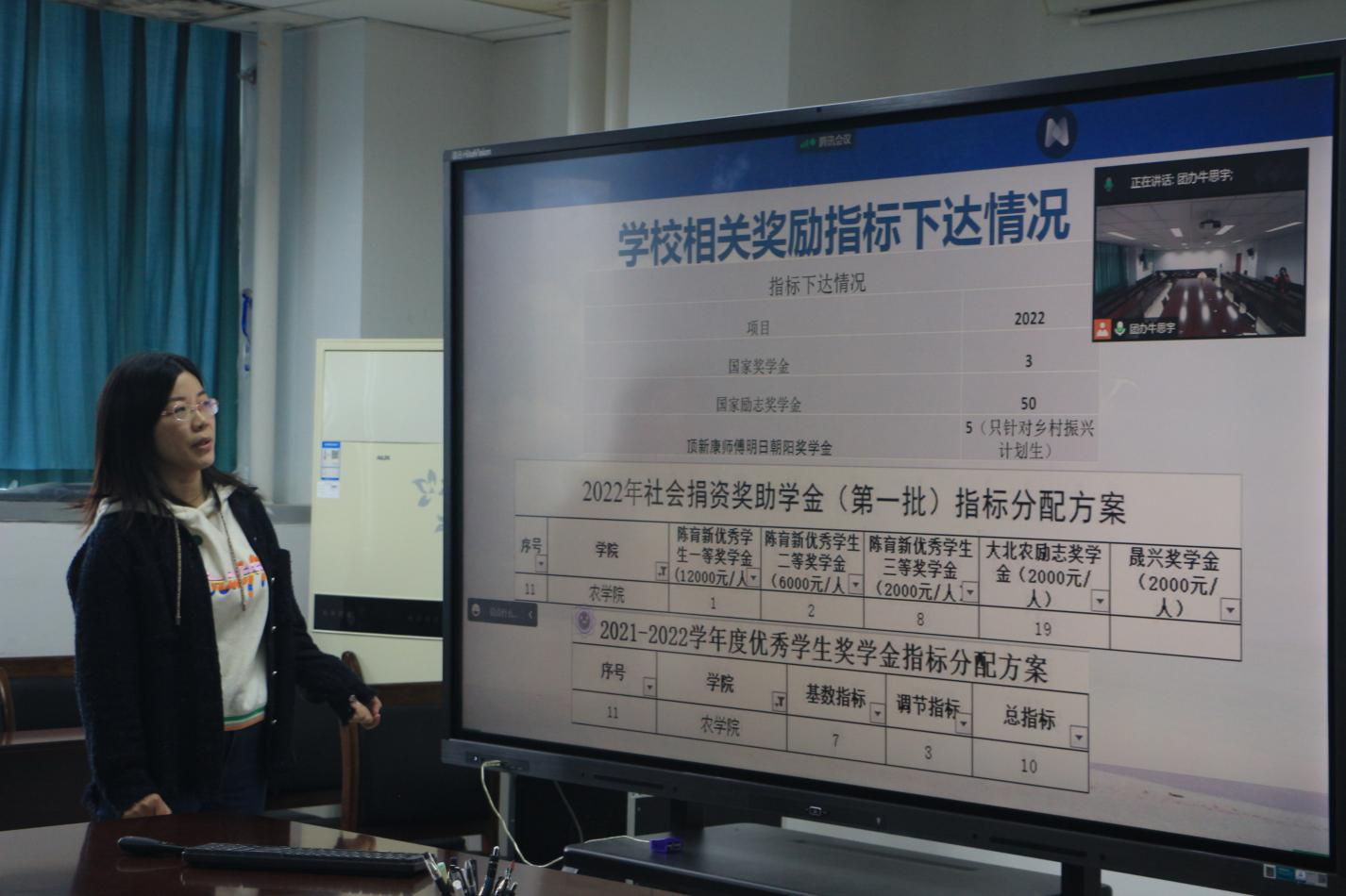 会上,沈丽淘强调了员工奖励和资助工作的重要性。她要求班主任全程参与评定与认定过程,且所有过程公开、公平、公正、透明。紧接着,沈丽淘通过PPT对优秀员工、优秀员工干部、国家奖学金及国家励志奖学金等荣誉奖励评定工作相关要求进行解读,包括员工奖励及资助的分类、参评范围和条件、评定工作安排、流程等。她指出了本学年一些相关工作的变化,对奖励及资助工作中的指标名额分配、破格条件等注意事项做了相应的补充,让与会人员对本次奖励及资助工作有了更充分的认识。