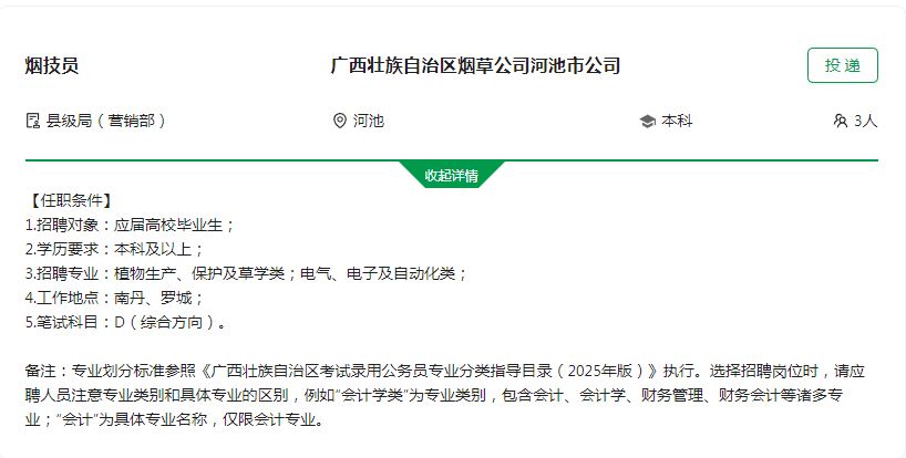 广西壮族自治区烟草专卖局(公司)2025年度高校毕业生招聘公告_国家烟草专卖局 http://www.tobacco.gov.cn/gjyc/zpxx/202502/b423a4f7d20c492c88c01c2958a5e53f.shtml