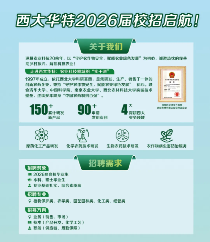 详情点击:西大华特2026届校招启航! https://mp.weixin.qq.com/s?__biz=MzA4OTIwNDEwMw==&mid=2652268527&idx=2&sn=1bc2e9ee0fcf864961adc5aa17921beb&chksm=8ac15185a6dbbffec728a4a63b2cbed9060a546595a894e62be1964e2cffe9983bd5ccf31ebf&mpshare=1&scene=23&srcid=0916nD2TB6yVEdV1XjZHxkr2&sharer_shareinfo=8966105933f3fcda260f6485cf80b138&sharer_shareinfo_first=e8bd97835ea0fa0510de3830a740066b#rd
