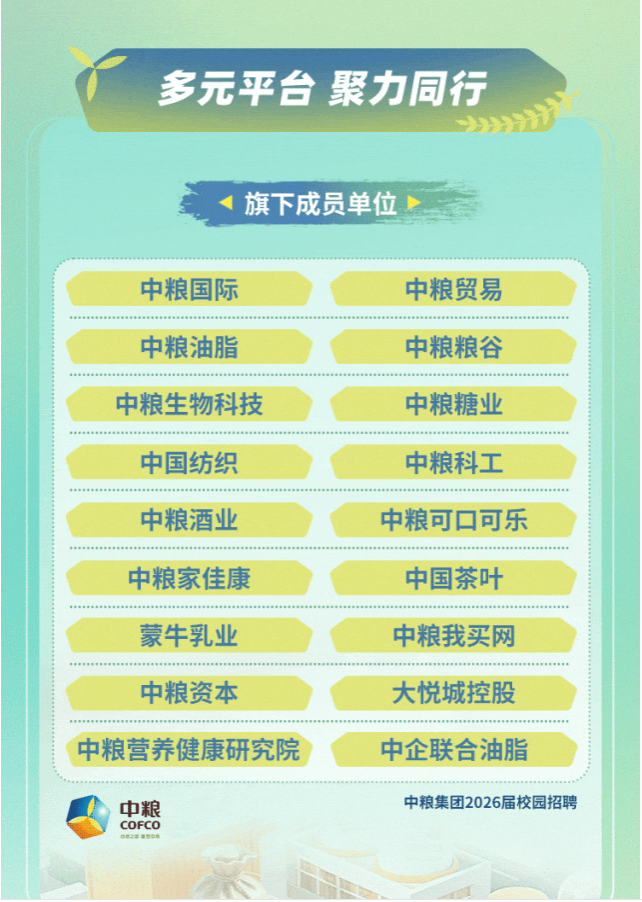 详情点击:以青春之名 守护大国粮安 | 中粮集团2026届校园招聘正式启动!https://mp.weixin.qq.com/s?__biz=MzI5NjMxMzQ2OA==&mid=2247540885&idx=2&sn=1112503ed47c5d460aeb8971fe011469&chksm=ed681d8ff1769fd3c2b9851bfe722fc219c0ecd9817baff26b37a72b1e58ff9e3f3706171275&mpshare=1&scene=23&srcid=1010v7MQmrwouvWfuqexK8pT&sharer_shareinfo=a4e7625e7cf0ff2653d2c62ea80b2276&sharer_shareinfo_first=a4e7625e7cf0ff2653d2c62ea80b2276#rd