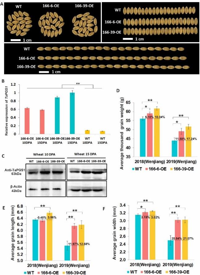 Plant transcription factors, such as basic helix-loop-helix (bHLH) and AT-rich zinc-binding proteins (PLATZ), play criticalrolesin regulating the expression of developmental genesin cereals. We identified the bHLH protein TaPGS1 (T. aestivumPositive Regulator of Grain Size 1) specifically expressed in the seeds at 5–20 days post-anthesis in wheat.TaPGS1was ectopically overexpressed (OE) in wheat and rice, leading to increased grain weight (up to 13.81% in wheat and 18.55% in rice lines) and grain size. Carbohydrate and total protein levels also increased. Scanning electron microscopy results indicated that the starch granules in the endosperm ofTaPGS1OE wheat and rice lines were smaller and tightly embedded in a proteinaceous matrix. Furthermore,TaPGS1 was bound directly to the E-box motif at the promoter of the PLATZ transcription factor genesTaFl3andOsFl3and positively regulated their expression in wheat and rice. In rice, theOsFl3CRISPR/Cas9 knockout lines showed reduced average thousand-grain weight, grain width, and grain length in rice. Our results reveal thatTaPGS1functions as a valuable trait-associated gene for improving cereal grain yield.