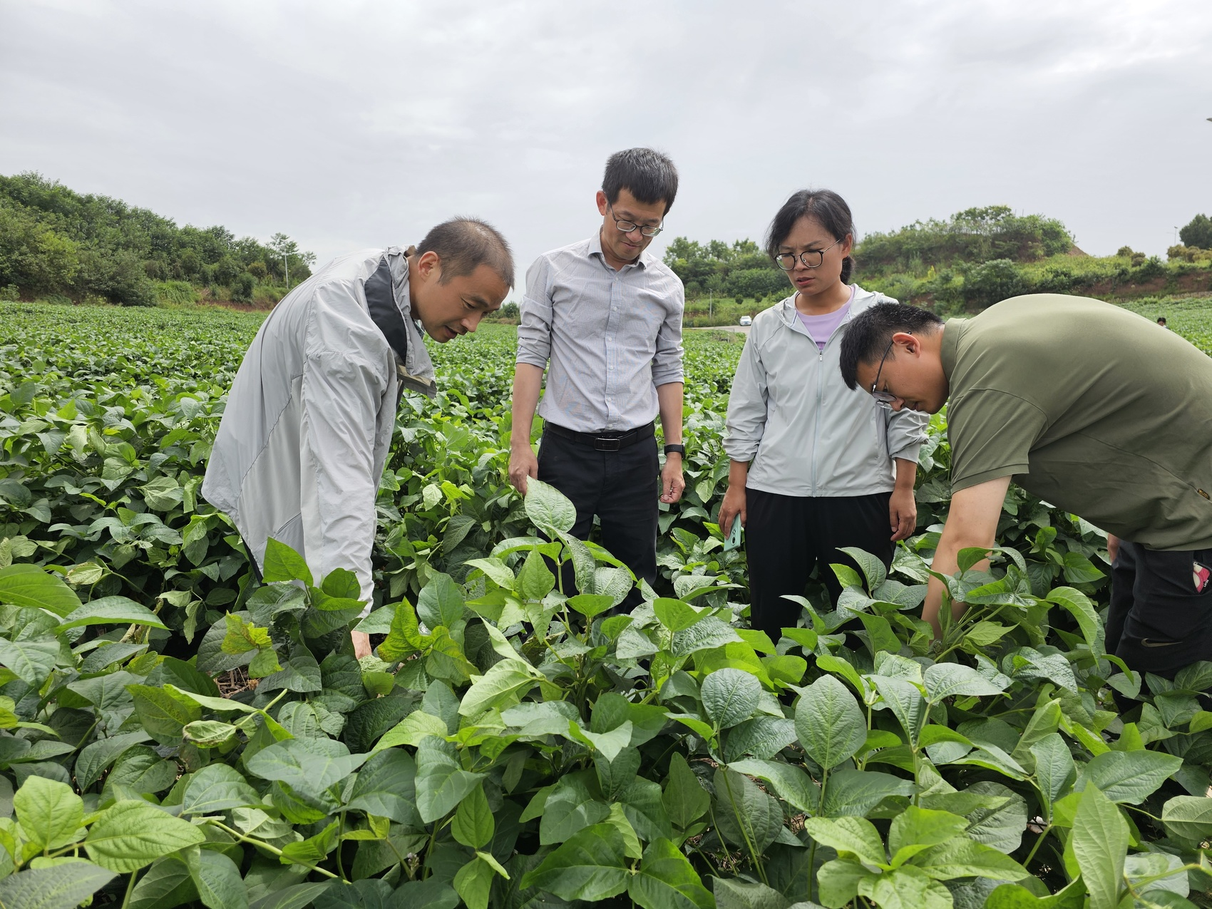 tyc5997太阳集团副教授常小丽和专家一起查看大豆长势。